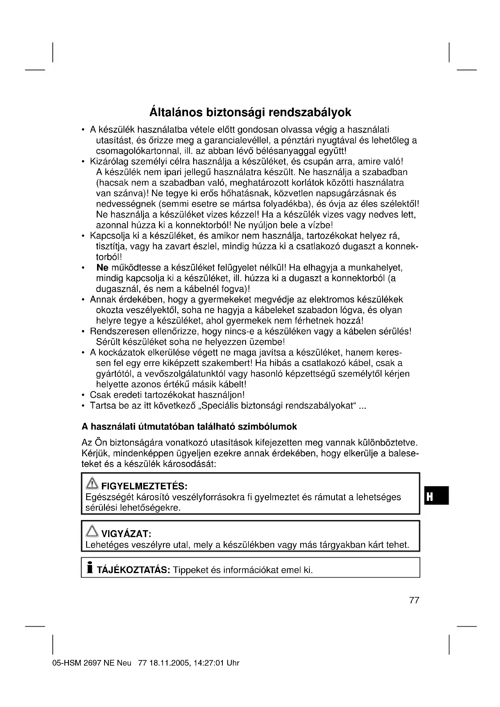 - Tartsa be az itt következő „Speciális biztonsági rendszabályokat“ ... A használati útmutatóban található szimbólumok Az Ön biztonságára vonatkozó utasítások kifejezetten meg vannak különböztetve. Kérjük, mindenképpen ügyeljen ezekre annak érdekében, hogy elkerülje a balese- teket és a készülék károsodását: FIGYELMEZTETÉS: Egészségét károsító veszélyforrásokra fi gyelmeztet és rámutat a lehetséges sérülési lehetőségekre. VIGYÁZAT: Lehetéges veszélyre utal, mely a készülékben vagy más tárgyakban kárt tehet. TÁJÉKOZTATÁS: Tippeket és információkat emel ki. 05-HSM 2697 NE Neu 77 18.11.2005, 14:27:01 UhrH