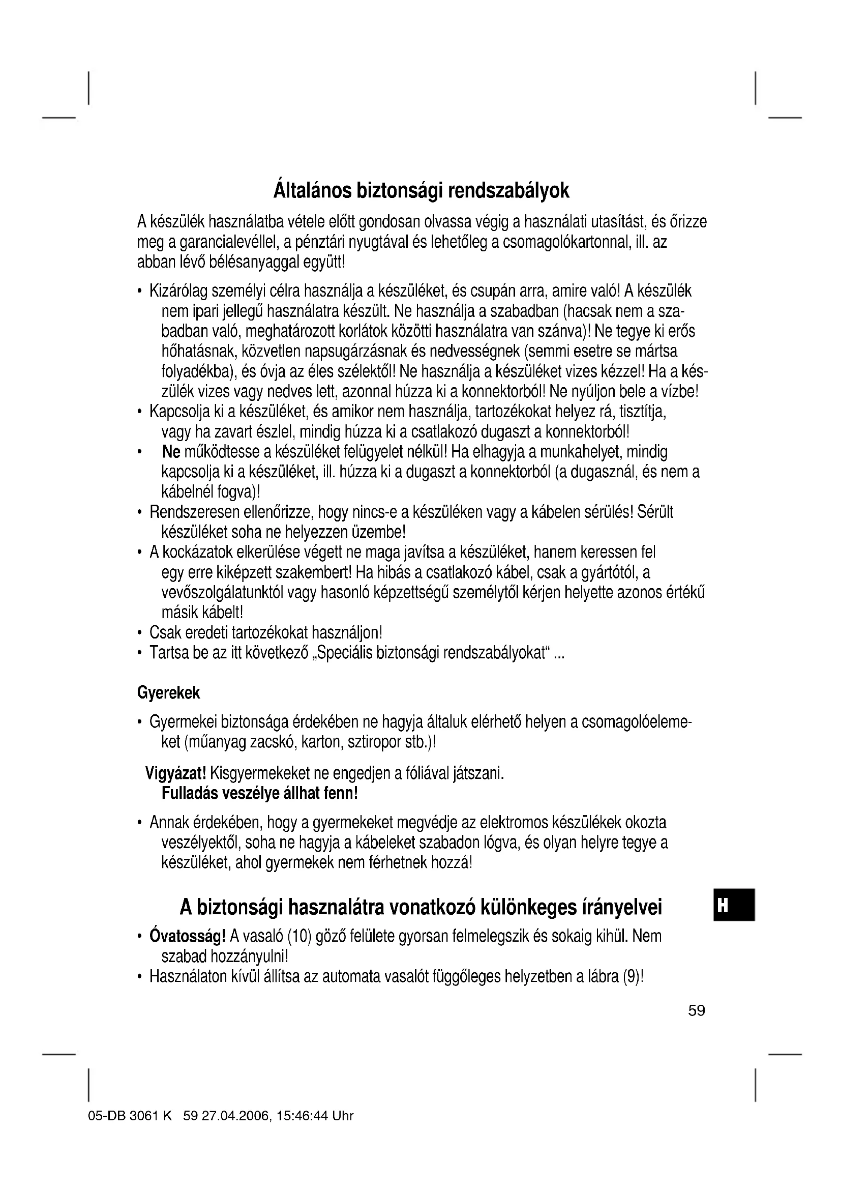 - Használaton kívül állítsa az automata vasalót függőleges helyzetben a lábra (9)! 05-DB 3061 K 59 27.04.2006, 15:46:44 UhrH