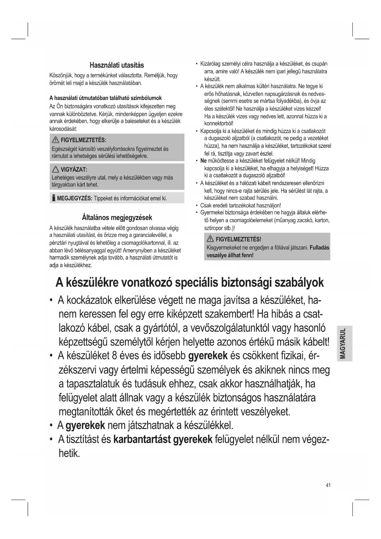 - A tisztítást és karbantartást gyerekek felügyelet nélkül nem végez- hetik.42