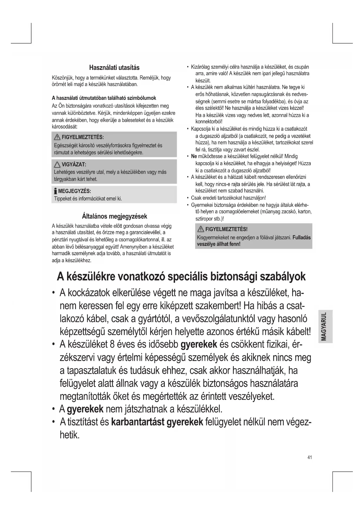 - A tisztítást és karbantartást gyerekek felügyelet nélkül nem végez- hetik.42