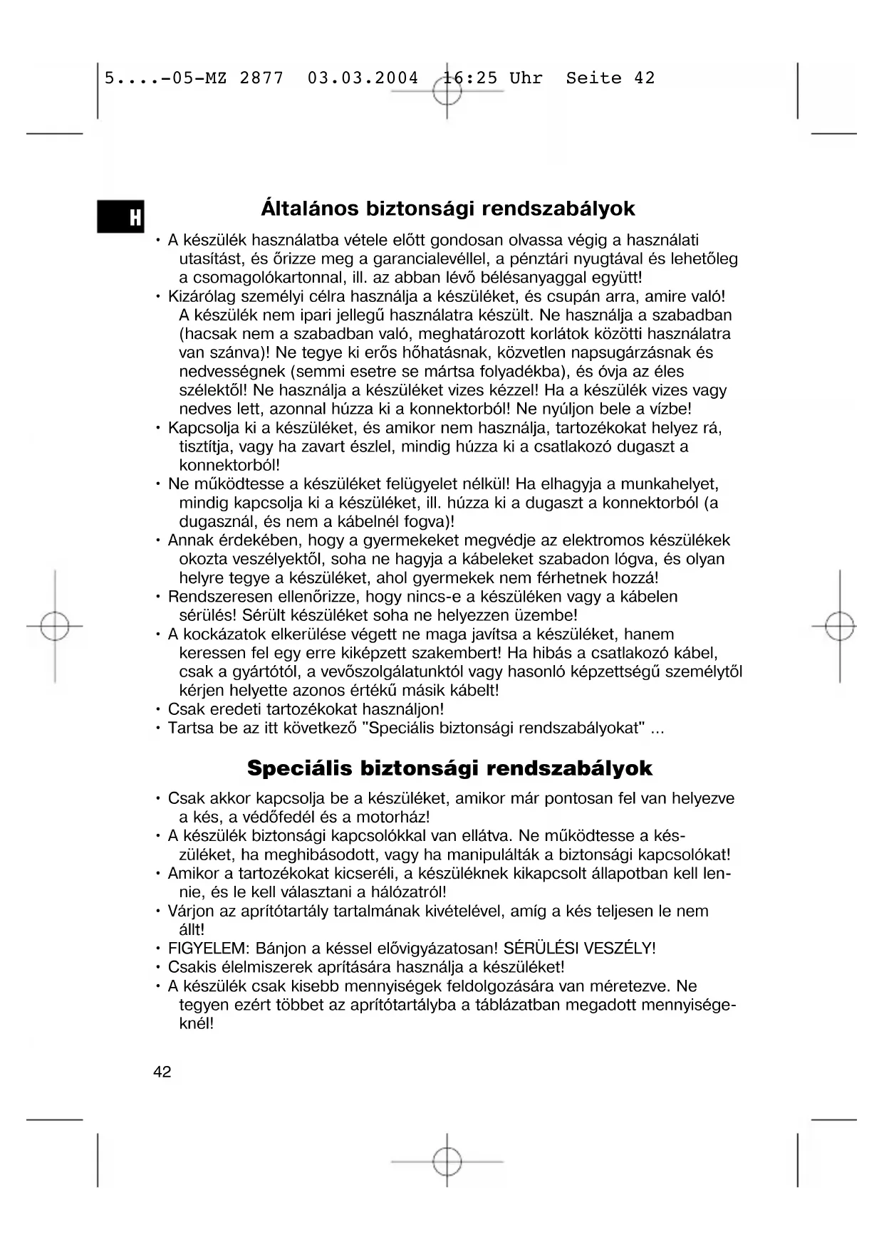 5....-05-MZ 2877 03.03.2004 16:25 Uhr Seite 44Garancia Az általunk forgalmazott készülékre a vétel időpontjától (pénztári nyugta) számított 24 havi garanciát vállalunk. A garanciális időn belül saját mérlegelésünk szerint javítással vagy cserével díjtalanul megszüntetjük a készülék vagy a tartozék *) olyan hiányosságait, ame- lyek anyaghibára vagy gyártási hibára vezethetők vissza. A garanciális szolgál- tatások sem a garanciális idő meghosszabbítását nem eredményezik, sem nem alapoznak meg újabb garanciára való igényt! A garancia igazolására a pénztári nyugta szolgál. E nélkül az igazolás nélkül sem díjmentes csere, sem díjtalan javítás nem végezhető. Garanciális esetben szíveskedjék az alapkészüléket eredeti csomagolásában a pénztári nyugtával együtt átadni a kereskedőjének! *) A tartozékok a jogszabályban előírt szavatossági kötelezettség (6 hónap) hatálya alá tartoznak, és nem vezetnek az egész készülék díjtalan cseréjére. Ilyen esetben ne a készüléket küldje be, ill. rendelje meg, hanem vevőszolgálatunkkal egyeztetve csak a hibás tartozékot! Az üvegtörés okozta hibák mindig térítéskötelesek! Sem az elhasználódó tartozékokban, ill. kopó alkatrészekben (pl. szénkefe, dagasztóhorog, hajtószíj, póttávvezérlő, pótfogkefe, fűrészlap stb.) bekövetkező hibák, sem a tisztítás, karbantartás vagy a kopó alkatrészek cseréje nem esik a garancia hatálya alá, következésképp térítésköteles. Illetéktelen beavatkozás a garancia megszűnését eredményezi. A garanciális idő után A garanciális idő eltelte után a megfelelő szakkereskedésben vagy javítószol- gálatnál végeztethet térítésköteles javításokat.
