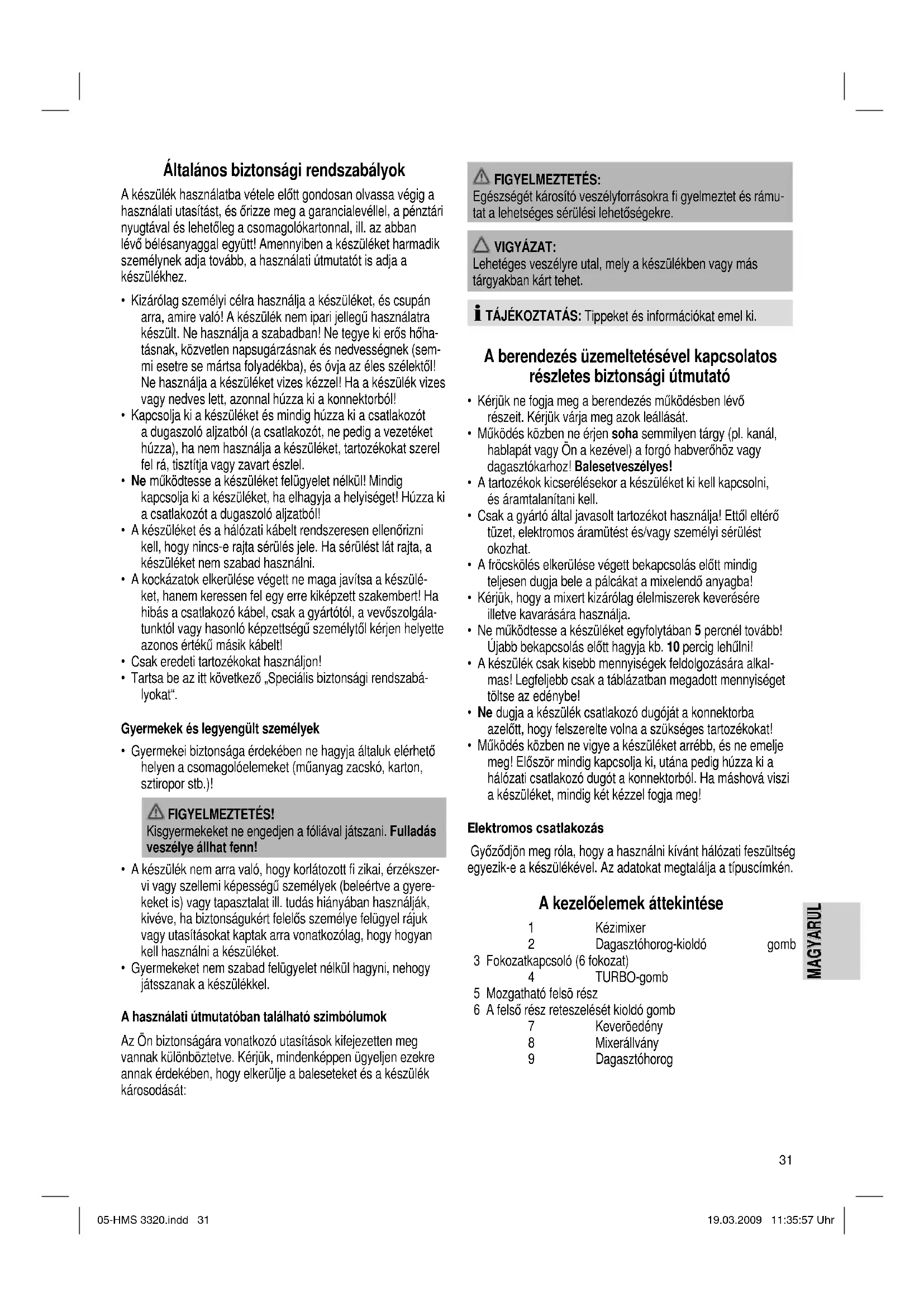- Működés közben ne vigye a készüléket arrébb, és ne emelje meg! Először mindig kapcsolja ki, utána pedig húzza ki a hálózati csatlakozó dugót a konnektorból. Ha máshová viszi a készüléket, mindig két kézzel fogja meg! Elektromos csatlakozás Győződjön meg róla, hogy a használni kívánt hálózati feszültség egyezik-e a készülékével. Az adatokat megtalálja a típuscímkén. A kezelőelemek áttekintése 1 Kézimixer 2 Dagasztóhorog-kioldó gomb 3 Fokozatkapcsoló (6 fokozat) 4 TURBO-gomb 5 Mozgatható felsõ rész 6 A felső rész reteszelését kioldó gomb 7 Keverõedény 8 Mixerállvány 9 Dagasztóhorog 05-HMS 3320.indd 3105-HMS 3320.indd 31 19.03.2009 11:35:57 Uhr19.03.2009 11:35:57 Uhr32 MAGYARUL MAGYARUL Turbó-üzemmód Rövid ideig a legnagyobb fordulatszámra kapcsolhatjuk a készüléket. Ha rövid idõközönként megnyomjuk, a készülék lüktetve üzemel. VIGYÁZAT: Ezt a funkciót legfeljebb 1 percig szabad használni. A dagasztóhorog/habverõ használata