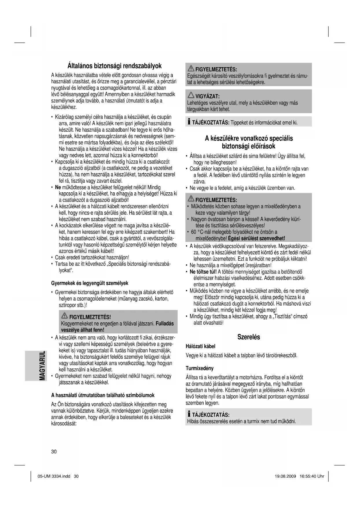 - Mindig úgy tisztítsa a készüléket, ahogy a „Tisztítás“ címszó alatt olvasható! Szerelés Hálózati kábel Vegye ki a hálózati kábelt a talpban lévő tárolórekeszből. Turmixedény Állítsa rá a keverőtartályt a motorházra. Fordítsa el a kiöntőt az óramutató járásával megegyező irányba, míg hallhatóan bepattan a helyére. Közben ügyeljen a jelölésekre. A kiöntőn lévő fekete nyíl és a talpon lévő zárt lakat pontosan egymással szemben legyen. TÁJÉKOZTATÁS: Hibás összeszerelés esetén a turmix nem tud működni. 05-UM 3334.indd 3005-UM 3334.indd 30 19.08.2009 16:55:40 Uhr19.08.2009 16:55:40 Uhr31 MAGYARUL MAGYARUL Használati tudnivalók