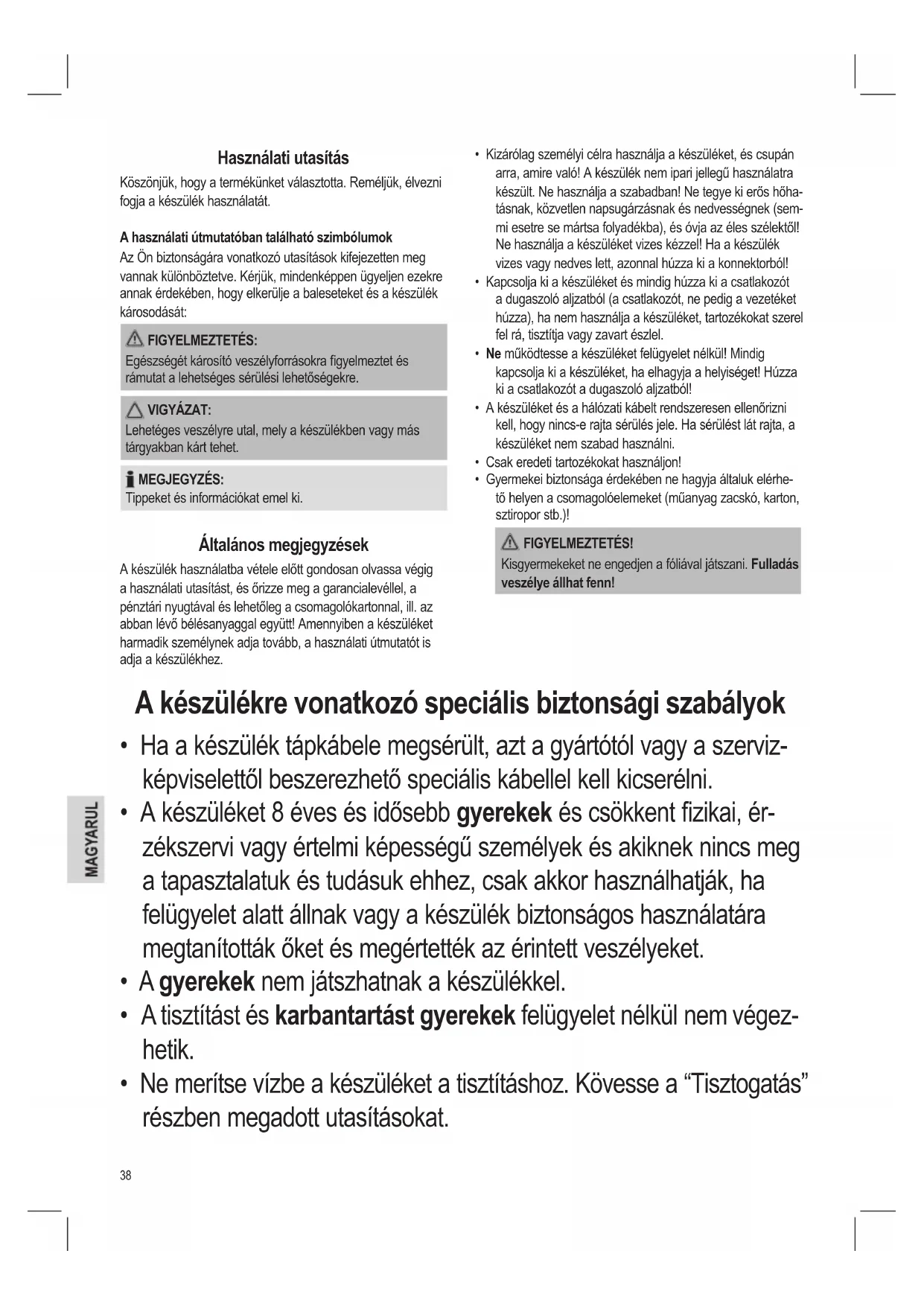 - Gyermekei biztonsága érdekében ne hagyja általuk elérhe- tő helyen a csomagolóelemeket (műanyag zacskó, karton, sztiropor stb.)! FIGYELMEZTETÉS! Kisgyermekeket ne engedjen a fóliával játszani. Fulladás veszélye állhat fenn! A készülékre vonatkozó speciális biztonsági szabályok