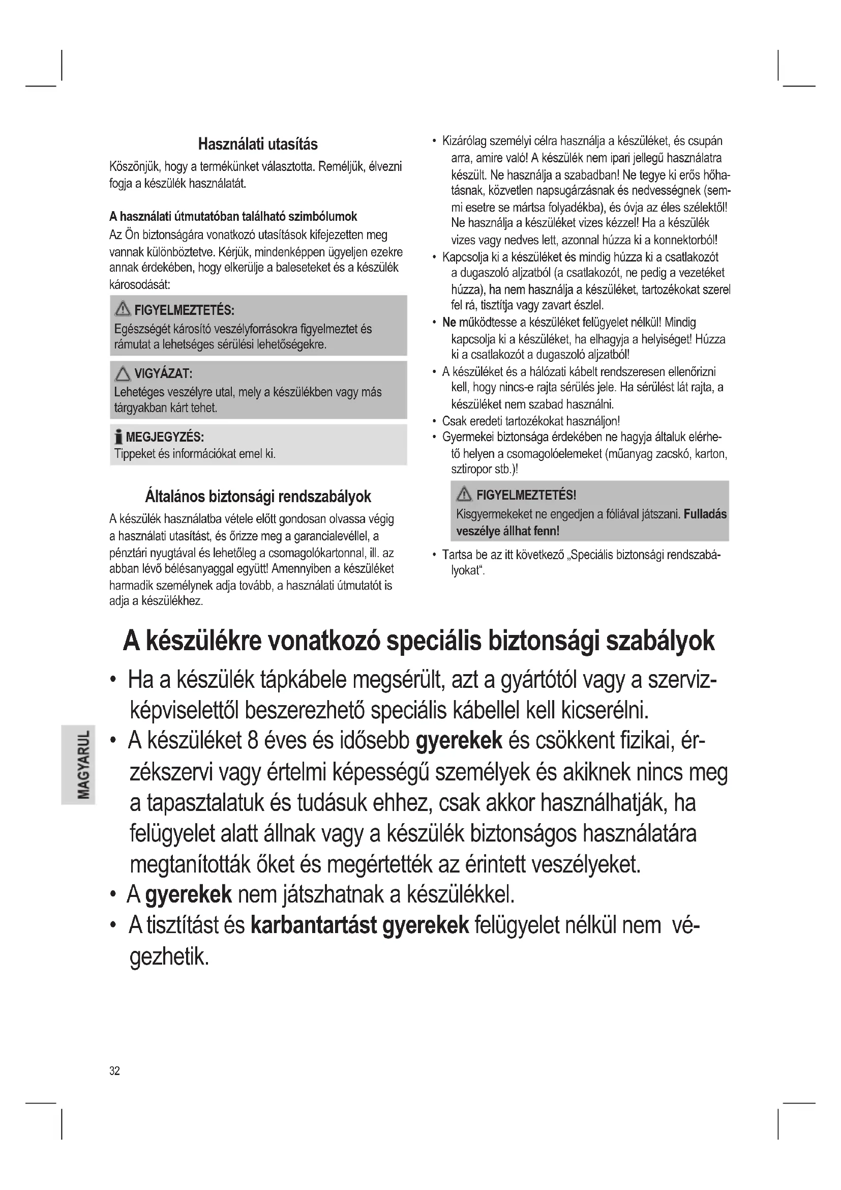 - A tisztítást és karbantartást gyerekek felügyelet nélkül nem vé- gezhetik.33