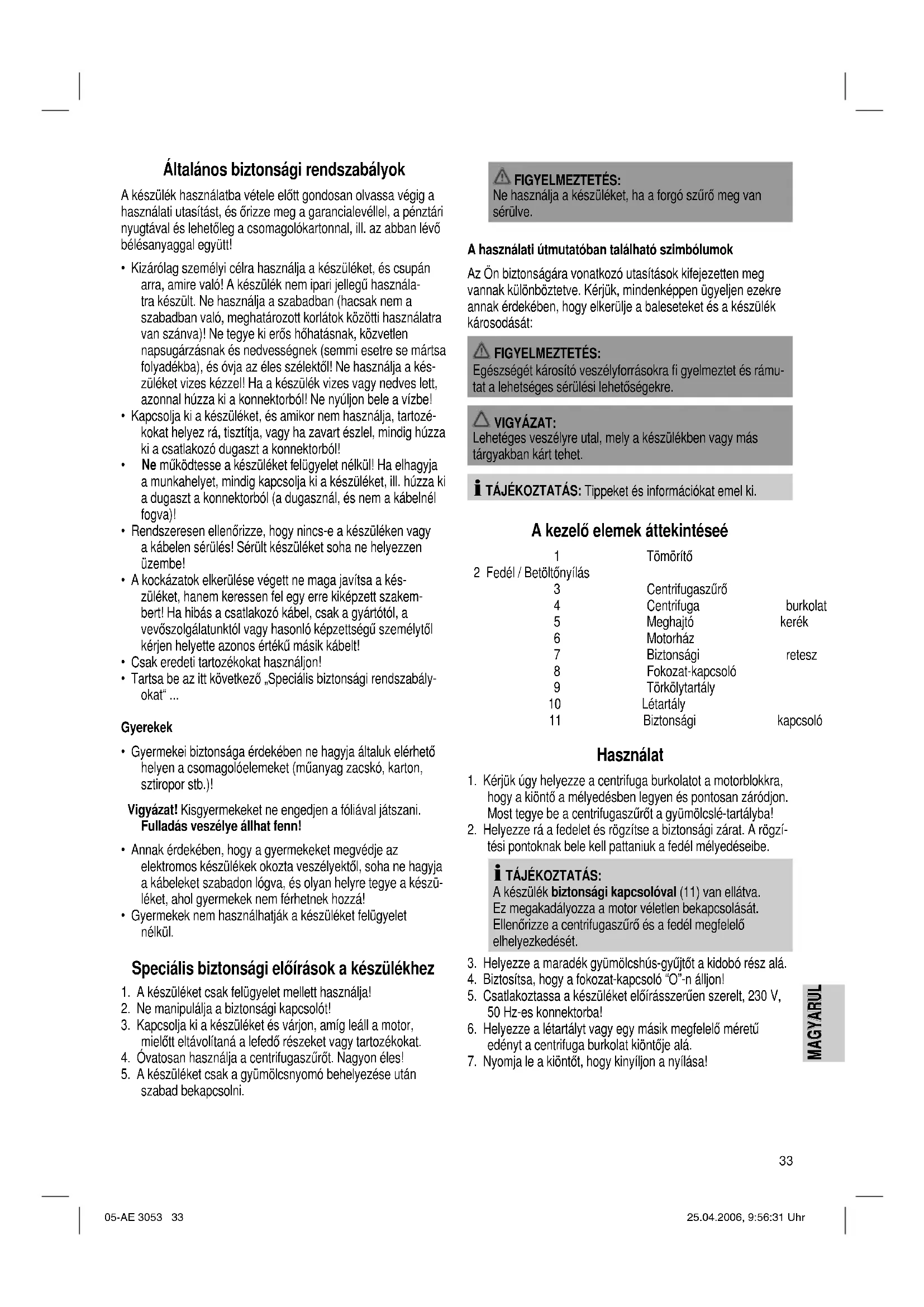 - Hagyja az alkatrészeket alaposan megszáradni, mielőtt újra összeszereli a készüléket! Hibaelhárítás A készülék nem működik. Megoldás: Ellenőrizze a hálózati csatlakozást. Ellenőrizze a kapcsoló helyezetét. Egyéb lehetséges okok: A készülék biztonsági kapcsolóval (11) van ellátva. Ez megakadályozza a motor véletlen bekapcsolását. Megoldás: Ellenőrizze, hogy a centrifugaszűrő és a fedél megfelelően vannak-e behelyezve. Műszaki adatok Modell: .............................................................................AE 3053 Feszültségellátás: .........................................220-240 V, 50/60 Hz Teljesítményfelvétel:............................................................ 800 W Védelmi osztály: ........................................................................... Ι Rövid üzemeltetési idő: ....................................................... 1 perc Ezt a készüléket az Európa Tanács minden vonatkozó aktuális irányelve szerint (pl. elektromágnesesség-elviselő képesség vagy kisfeszültség-elviselő képesség) ellenőriztük, és a legújabb biztonságtechnikai előírások szerint készült. Megjegyezzük az esetleges müszaki változásokat! 05-AE 3053 34 25.04.2006, 9:56:36 UhrMAGYARUL