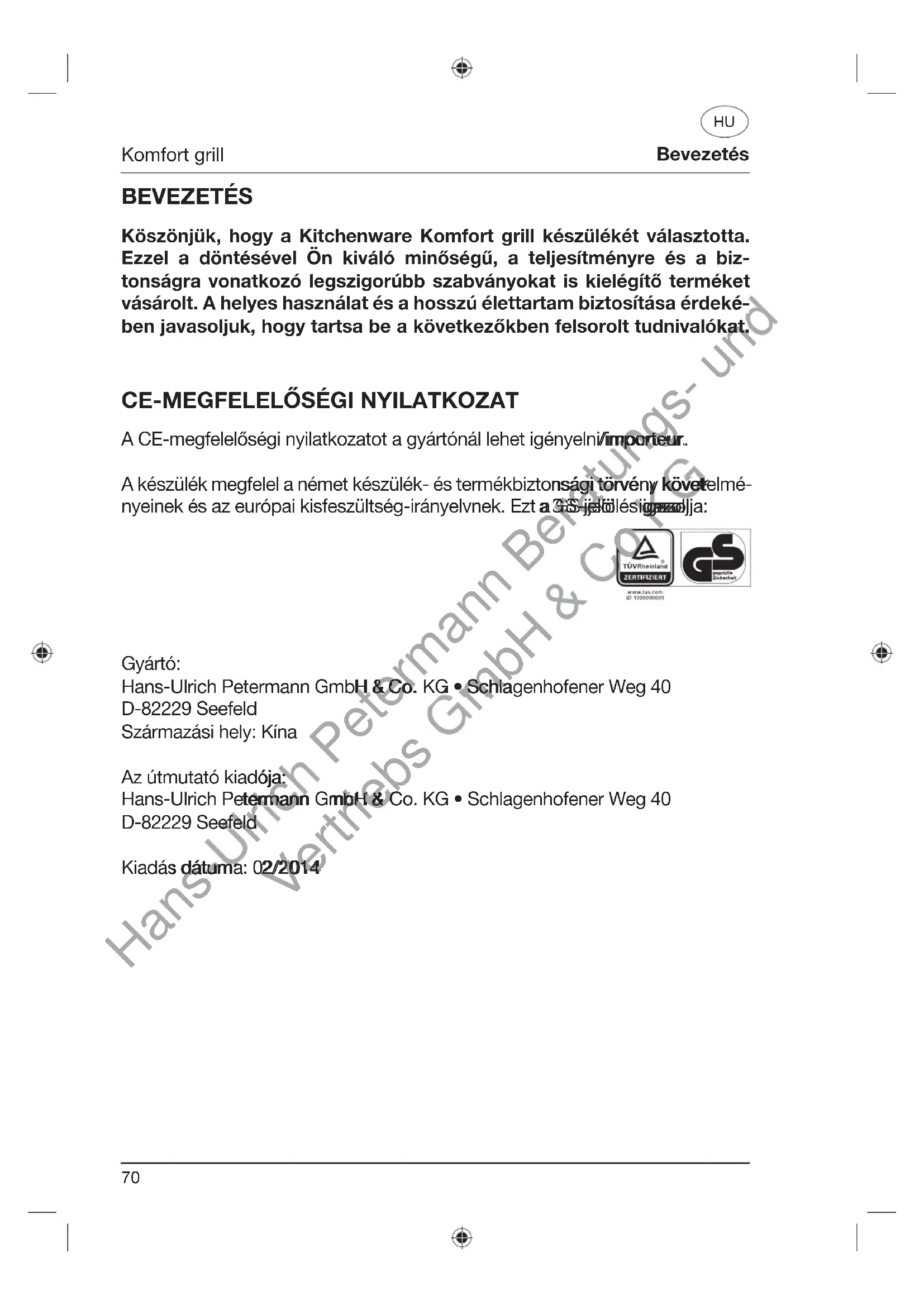 Köszönjuk, hovy a Kitchenware Komfort grill keszüléket valasztotta. Ezzel a dontésével On kivaló minõsegü, a teljesitményre és a bizzonságra vonatkozo legszigorübb szabványokat is kielegito terméket vásárolt. A helyes hasznalat és a hosszú elettartam biztositasa erdekében javasoljuk, hovy tartsa be a következőkben felsorolt tudnivalókat.