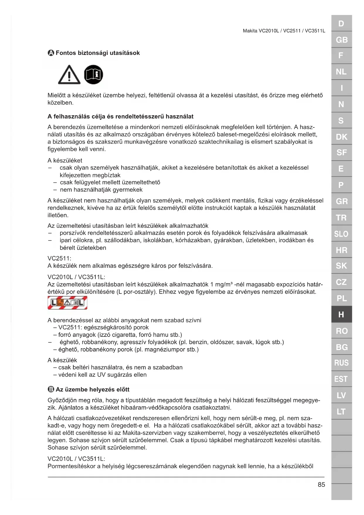Makita VC2010L / VC2511 / VC3511L Fontos biztonsági utasítások Mielőtt a készüléket üzembe helyezi, feltétlenül olvassa át a kezelési utasítást, és őrizze meg elérhető közelben. A felhasználás célja és rendeltetésszerű használat A berendezés üzemeltetése a mindenkori nemzeti előírásoknak megfelelően kell történjen. A hasz- nálati utasítás és az alkalmazó országában érvényes kötelező baleset-megelőzési eloírások mellett, a biztonságos és szakszerű munkavégzésre vonatkozó szaktechnikailag is elismert szabályokat is gyelembe kell venni. A készüléket – csak olyan személyek használhatják, akiket a kezelésére betanítottak és akiket a kezeléssel kifejezetten megbíztak – csak felügyelet mellett üzemeltethető – nem használhatják gyermekek A készüléket nem használhatják olyan személyek, melyek csökkent mentális, zikai vagy érzékeléssel rendelkeznek, kivéve ha az értük felelős személytől elötte instrukciót kaptak a készülék használatát illetően. Az üzemeltetési utasításban leírt készülékek alkalmazhatók – porszívók rendeltetésszerű alkalmazás esetén porok és folyadékok felszívására alkalmasak – ipari célokra, pl. szállodákban, iskolákban, kórházakban, gyárakban, üzletekben, irodákban és bérelt üzletekben VC2511: A készülék nem alkalmas egészségre káros por felszívására. VC2010L / VC3511L: Az üzemeltetési utasításban leírt készülékek alkalmazhatók 1 mg/m³ -nél magasabb expozíciós határ- értékű por elkülönítésére (L por-osztály). Ehhez vegye gyelembe az érvényes nemzeti előírásokat. A berendezéssel az alábbi anyagokat nem szabad szívni – VC2511: egészségkárosító porok – forró anyagok (izzó cigaretta, forró hamu stb.) – éghető, robbanékony, agresszív folyadékok (pl. benzin, oldószer, savak, lúgok stb.) – éghető, robbanékony porok (pl. magnéziumpor stb.) A készülék – csak beltéri használatra, és nem a szabadban – védeni kell az UV sugárzás ellen Az üzembe helyezés előtt Győződjön meg róla, hogy a típustáblán megadott feszültség a helyi hálózati feszültséggel megegye- zik. Ajánlatos a készüléket hibaáram-védőkapcsolóra csatlakoztatni. A hálózati csatlakozóvezetéket rendszeresen ellenőrizni kell, hogy nem sérült-e meg, pl. nem sza- kadt-e, vagy hogy nem öregedett-e el. Ha a hálózati csatlakozókábel sérült, akkor azt a további hasz- nálat előtt cseréltesse ki az Makita-szervizben vagy szakemberrel, hogy a veszélyeztetés elkerülhető legyen. Sohase szívjon sérült szűrőelemmel. Csak a típusú tápkábel meghatározott kezelési utasítás. Sohase szívjon sérült szűrőelemmel. VC2010L / VC3511L: Pormentesítéskor a helyiség légcsereszámának elegendően nagynak kell lennie, ha a készülékbőlD