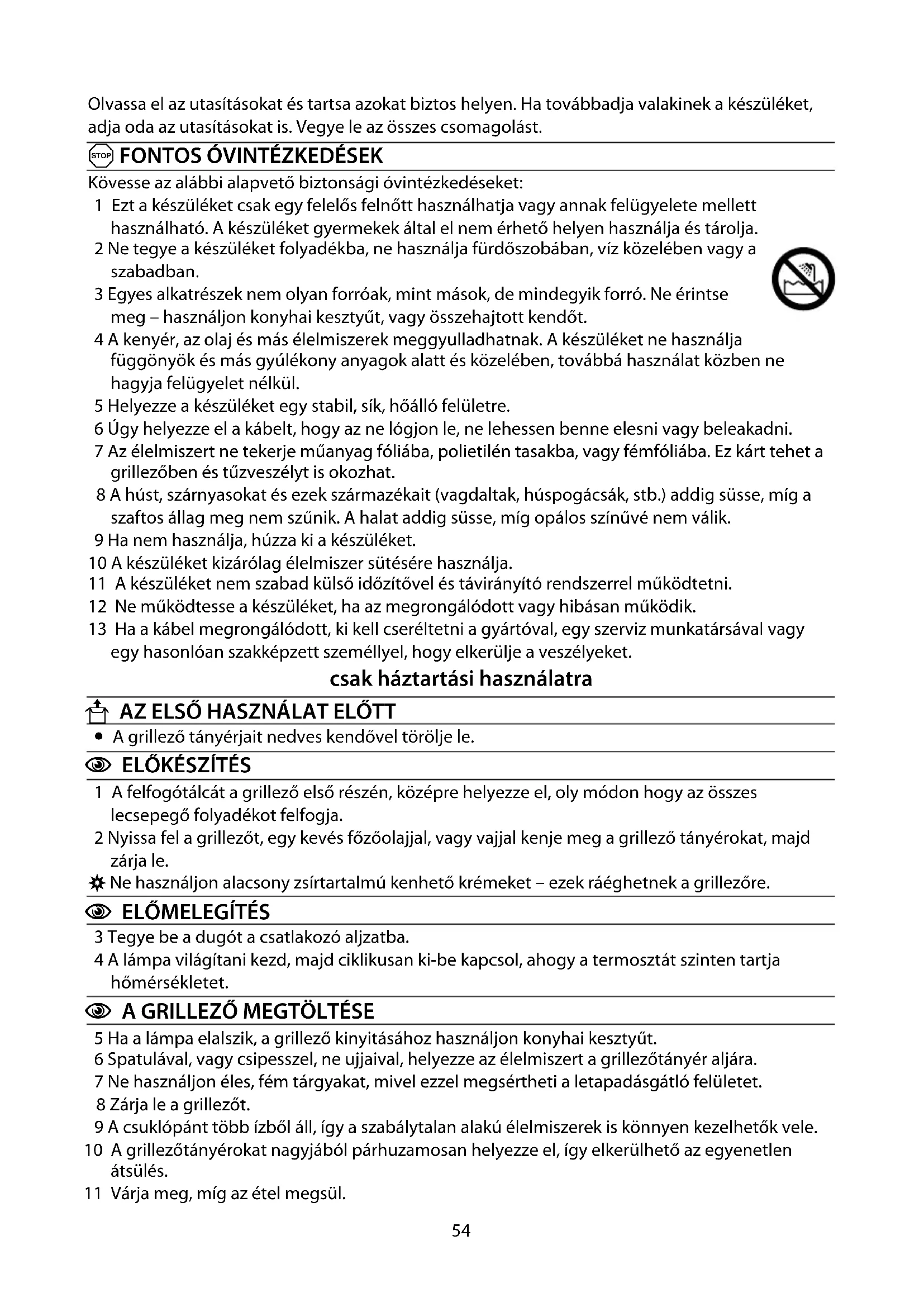 7 Az élelmiszert ne tekerje műanyag fóliába, polietilén tasakba, vagy fémfóliába. Ez kárt tehet a grillezőben és tűzveszélyt is okozhat.