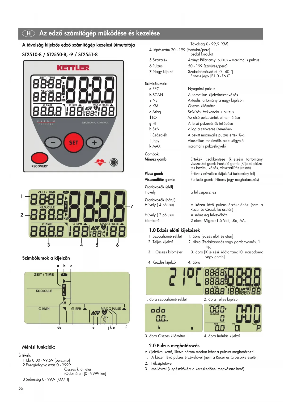 Távolság 0 - 99,9 [KM] 4 Lépésszám 20 - 199 [fordulat/perc] pedál fordulat 5 Százalék Arány: Pillanatnyi pulzus – maximális pulzus 6 Pulzus 50 - 199 [szívütés/perc] 7 Nagy kijelző Szobahőmérséklet [0 - 40 °] Fitness jegy [F1.0 - F6.0] Szimbólumok: a REC Nyugalmi pulzus b SCAN Automatikus kijelzőnézet váltás c Nyil Aktuális tartomány a nagy kijelzőn d KM Összes kilóméter e Átlag Szívütési frekvencia + pulzus f LO Az alsó pulzusérték el nem érése g HI A felső pulzusérték túllépése h Szív villog a szívverés ütemében i Százalék A bevitt maximális pulzus érték %-a j Jegy Akusztikus maximális pulzusfigyelő k MAX maximális pulzusfigyelő Gombok: Mínusz gomb Értékek csökkentése (kijelzési tartomány vissza(Set gomb Funkció gomb (Kijelző előze- tes bevitel, váltás, visszaállítás (reset)) Plusz gomb Értékek növelése (kijelzési tartomány fel) Visszaállítás gomb Funkció gomb (Fitness jegy meghatározás) Csatlakozók (elől) Hüvely a fül csipeszhez Csatlakozók (hátul) Hüvely ( 4 pólusú) A kézen lévő pulzus érzékelőhöz (nem a Racer és Crossbike esetén) Hüvely ( 2 pólusú) A sebesség felvevőhöz Elemtartó 2 elem: Mignon1,5 Volt, LR6, AA,