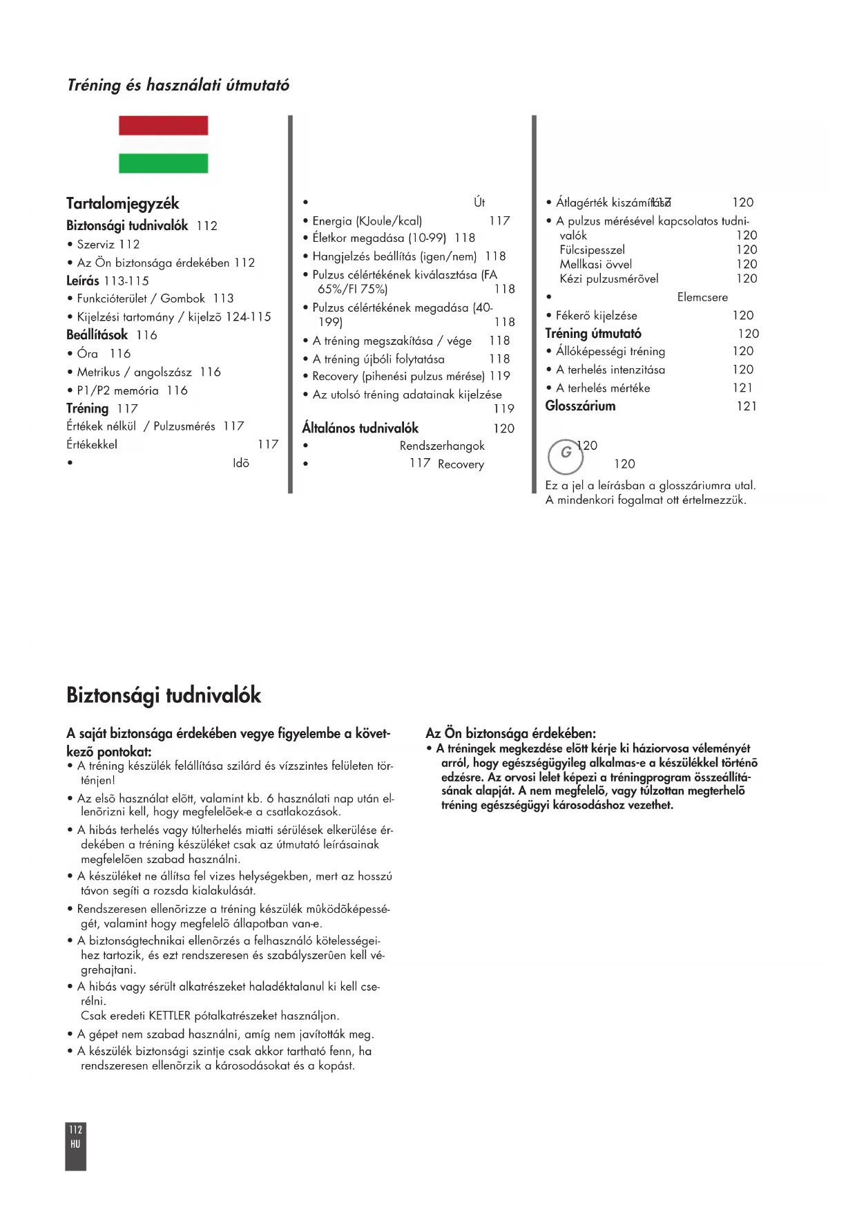 - A tréning készülék felállítása szilárd és vízszintes felületen tör-ténjen! • Az elsõ használat elõtt, valamint kb. 6 használati nap után el-lenõrizni kell, hogy megfelelõek-e a csatlakozások.• A hibás terhelés vagy túlterhelés miatti sérülések elkerülése ér-dekében a tréning készüléket csak az útmutató leírásainakmegfelelõen szabad használni.• A készüléket ne állítsa fel vizes helységekben, mert az hosszútávon segíti a rozsda kialakulását.• Rendszeresen ellenõrizze a tréning készülék mûködõképessé-gét, valamint hogy megfelelõ állapotban van-e.• A biztonságtechnikai ellenõrzés a felhasználó kötelességei-hez tartozik, és ezt rendszeresen és szabályszerûen kell vé-grehajtani.• A hibás vagy sérült alkatrészeket haladéktalanul ki kell cse-rélni.Csak eredeti KETTLER pótalkatrészeket használjon.• A gépet nem szabad használni, amíg nem javították meg.• A készülék biztonsági szintje csak akkor tartható fenn, harendszeresen ellenõrzik a károsodásokat és a kopást. Tartalomjegyzék Biztonsági tudnivalók 112