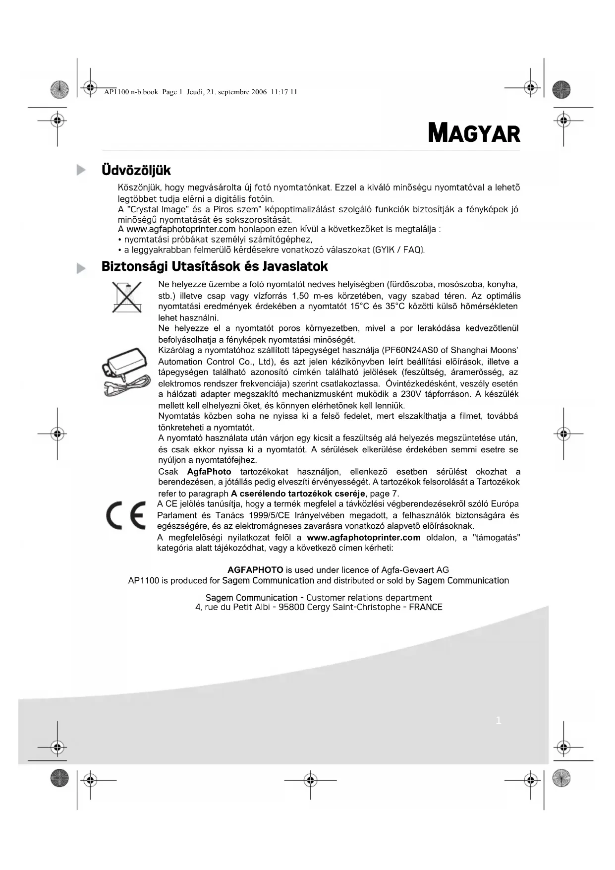 - a leggyakrabban felmerülõ kérdésekre vonatkozó válaszokat (GYIK / FAQ). Biztonsági Utasítások és Javaslatok Ne helyezze üzembe a fotó nyomtatót nedves helyiségben (fürdõszoba, mosószoba, konyha, stb.) illetve csap vagy vízforrás 1,50 m-es körzetében, vagy szabad téren. Az optimális nyomtatási eredmények érdekében a nyomtatót 15°C és 35°C közötti külsõ hõmérsékleten lehet használni. Ne helyezze el a nyomtatót poros környezetben, mivel a por lerakódása kedvezõtlenül befolyásolhatja a fényképek nyomtatási minõségét. Kizárólag a nyomtatóhoz szállított tápegységet használja (PF60N24AS0 of Shanghai Moons' Automation Control Co., Ltd), és azt jelen kézikönyvben leírt beállítási elõírások, illetve a tápegységen található azonosító címkén található jelölések (feszültség, áramerõsség, az elektromos rendszer frekvenciája) szerint csatlakoztassa. Óvintézkedésként, veszély esetén a hálózati adapter megszakító mechanizmusként muködik a 230V tápforráson. A készülék mellett kell elhelyezni õket, és könnyen elérhetõnek kell lenniük. Nyomtatás közben soha ne nyissa ki a felsõ fedelet, mert elszakíthatja a filmet, továbbá tönkreteheti a nyomtatót. A nyomtató használata után várjon egy kicsit a feszültség alá helyezés megszüntetése után, és csak ekkor nyissa ki a nyomtatót. A sérülések elkerülése érdekében semmi esetre se nyúljon a nyomtatófejhez. Csak AgfaPhoto tartozékokat használjon, ellenkezõ esetben sérülést okozhat a berendezésen, a jótállás pedig elveszíti érvényességét. A tartozékok felsorolását a Tartozékok refer to paragraph A cserélendo tartozékok cseréje, page 7. A CE jelölés tanúsítja, hogy a termék megfelel a távközlési végberendezésekrõl szóló Európa Parlament és Tanács 1999/5/CE Irányelvében megadott, a felhasználók biztonságára és egészségére, és az elektromágneses zavarásra vonatkozó alapvetõ elõírásoknak. A megfelelõségi nyilatkozat felõl a www.agfaphotoprinter.com oldalon, a "támogatás" kategória alatt tájékozódhat, vagy a következõ címen kérheti: AGFAPHOTO is used under licence of Agfa-Gevaert AG AP1100 is produced for Sagem Communication and distributed or sold by Sagem Communication Sagem Communication - Customer relations department 4, rue du Petit Albi - 95800 Cergy Saint-Christophe - FRANCE AP1100 n-b.book Page 1 Jeudi, 21. septembre 2006 11:17 112 Környezet A környezetvédelem a fenntartható fejlesztési logika részeként a AgfaPhoto nagyon fontos szempontja. A AgfaPhoto célja, hogy a környezetet figyelembe vevõ rendszereket mûködtessen, és ezért úgy döntött, hogy integrálja a környezetvédelmi teljesítményeket a termékeinek életciklusába a gyártástól az üzembe helyezésig, felhasználásig és eltávolításig. CSOMAGOLÁS A logó (zöld pont) jelenléte azt jelenti, hogy a cég hozzájárulást fizet egy engedélyezett országos szervezet részére a csomagolás újrahasznosításának és az újrafeldolgozó infrastruktúrák fejlesztésére. Az újrahasznosítás elõsegítése érdekében kérjük, tartsa be a különválogatási szabályokat, melyeket helyileg erre a hulladéktípusra állapítottak meg. AKKUMULÁTOROK Ha a terméke akkumulátorokat tartalmaz, megfelelõ gyûjtõhelyeken kell leadni õket.