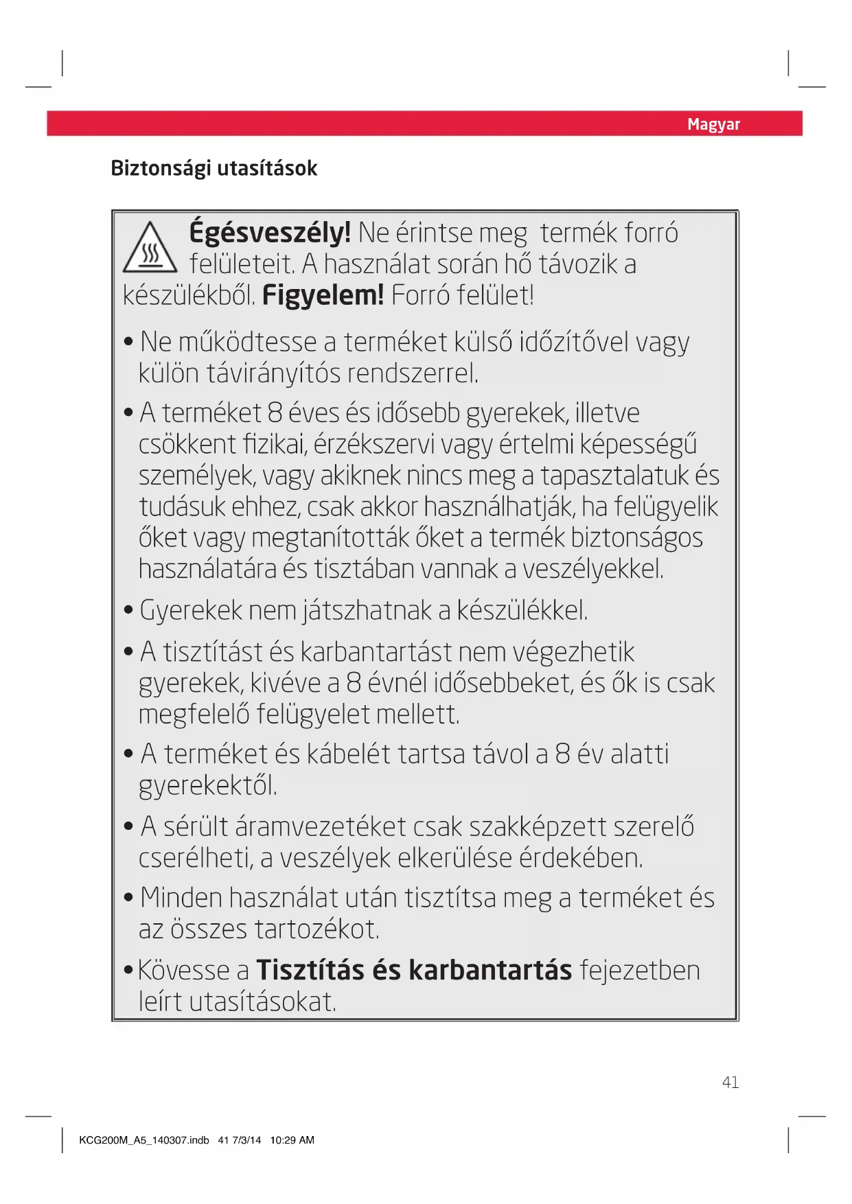A felső burkolat és a termék sütőlapjai a hasznalat során nagyon forrók lesznek.