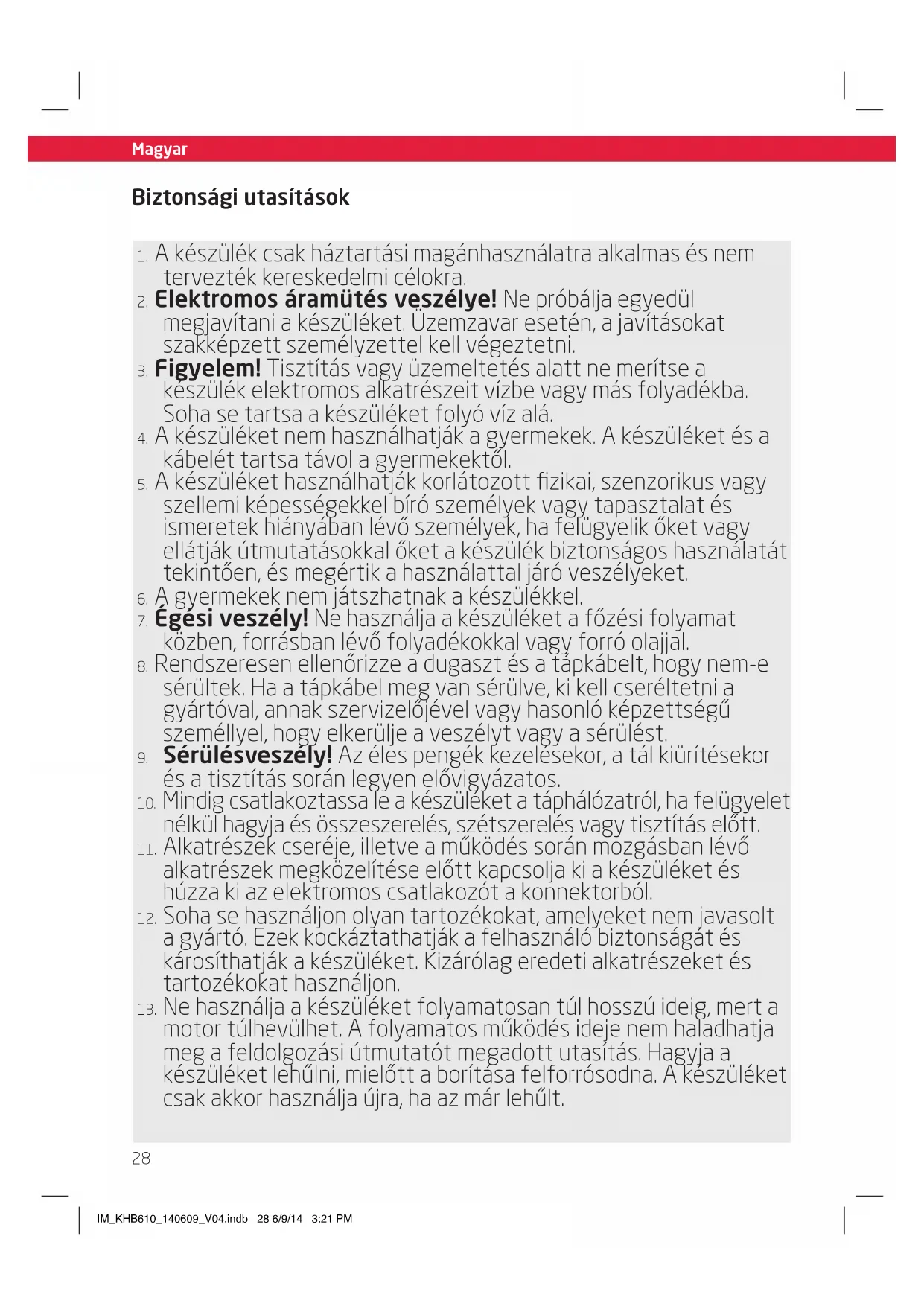 motor túlhevülhet. A folyamatos működés ideje nem haladhatja meg a feldolgozási útmutatót megadott utasítás. Hagyja a készüléket lehűlni, mielőtt a borítása felforrósodna. A készüléket csak akkor használja újra, ha az már lehűlt. IM_KHB610_140609_V04.indb 28 6/9/14 3:21 PM29 Magyar Biztonsági utasítások