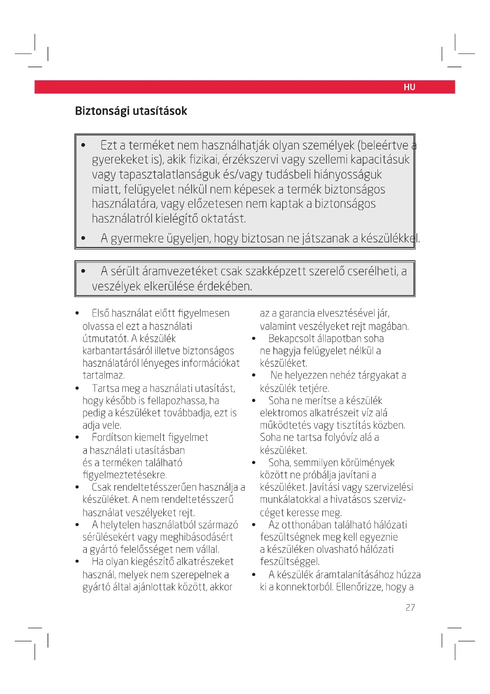 - Ezt a terméket nem használatják olyan személyek (beleérte a gyerekeket is), akik fizikai, érzékszervi vagy szellemi kapacitásuk vagy tapasztalatlanságuk és/vagy tudásbeli hiányosságuk miatt, felügyelet nélkül nem képesek a termék biztonságos használatára, vagy előzetesen nem kaptak a biztonságos használatró lkiégítő oktatást.