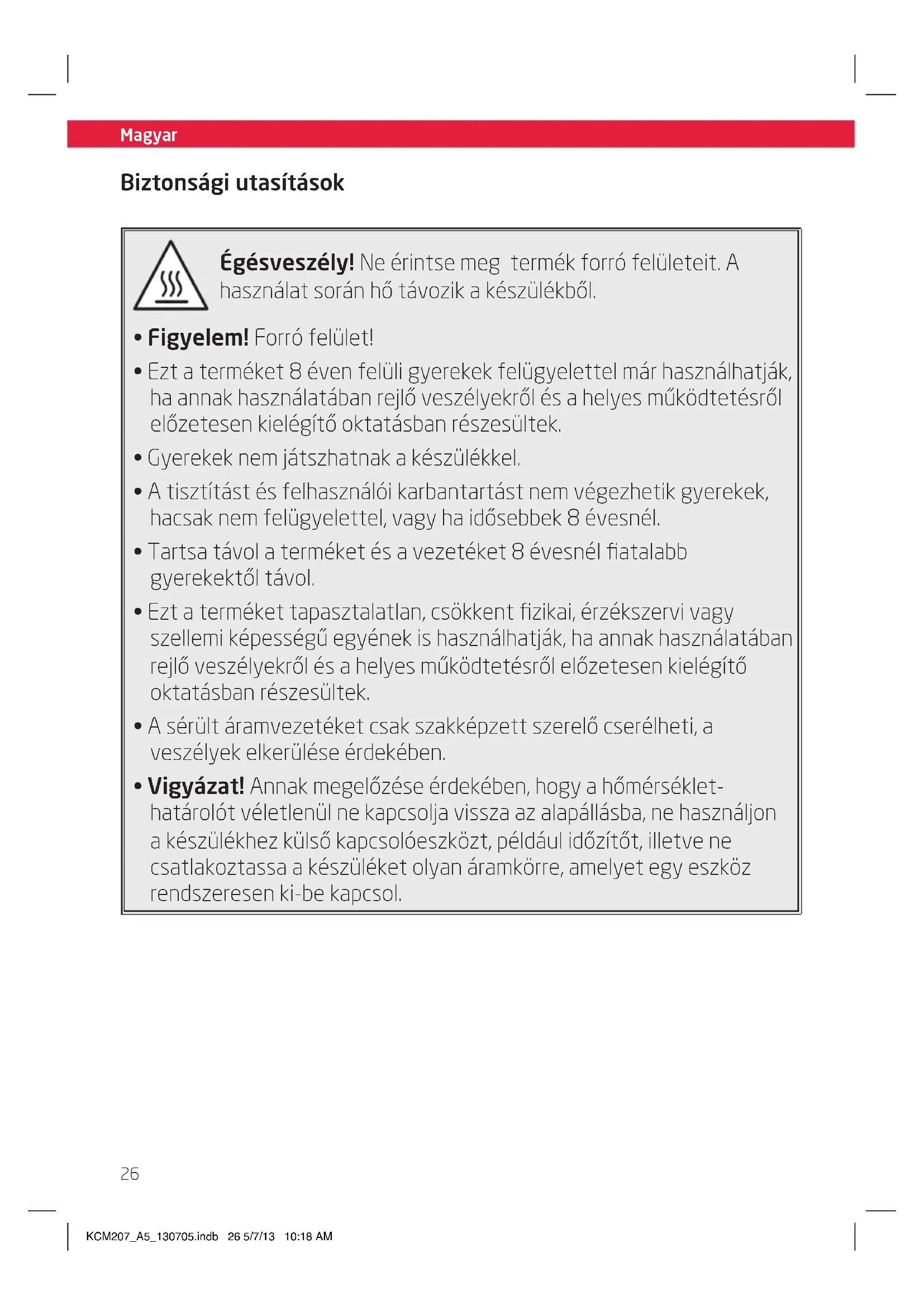 - Vigyázat! Annak megelőzése érdekében, hogy a hőmérséklet- határolót véletlenül ne kapcsolja vissza az alapállásba, ne használjon a készülékhez külső kapcsolóeszközt, például időzítőt, illetve ne csatlakoztassa a készüléket olyan áramkörre, amelyet egy eszköz rendszeresen ki-be kapcsol. KCM207_A5_130705.indb 26 5/7/13 10:18 AMMagyar