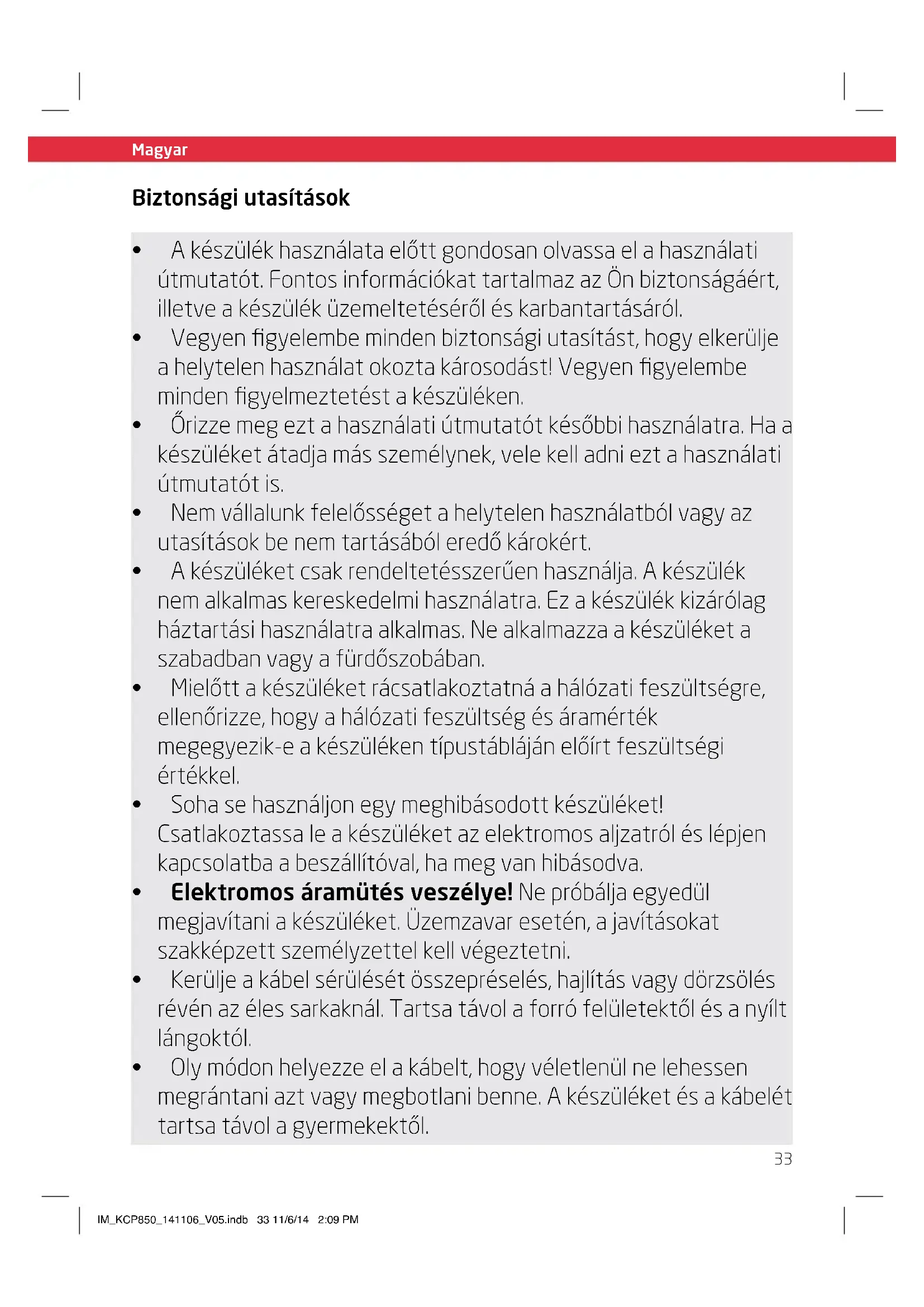 - Olymódonhelyezzeelakábelt,hogyvéletlenülnelehessen megrántaniaztvagymegbotlanibenne.Akészüléketésakábelét tartsatávolagyermekektől. Biztonsági utasítások IM_KCP850_141106_V05.indb 33 11/6/14 2:09 PM34 Magyar Magyar