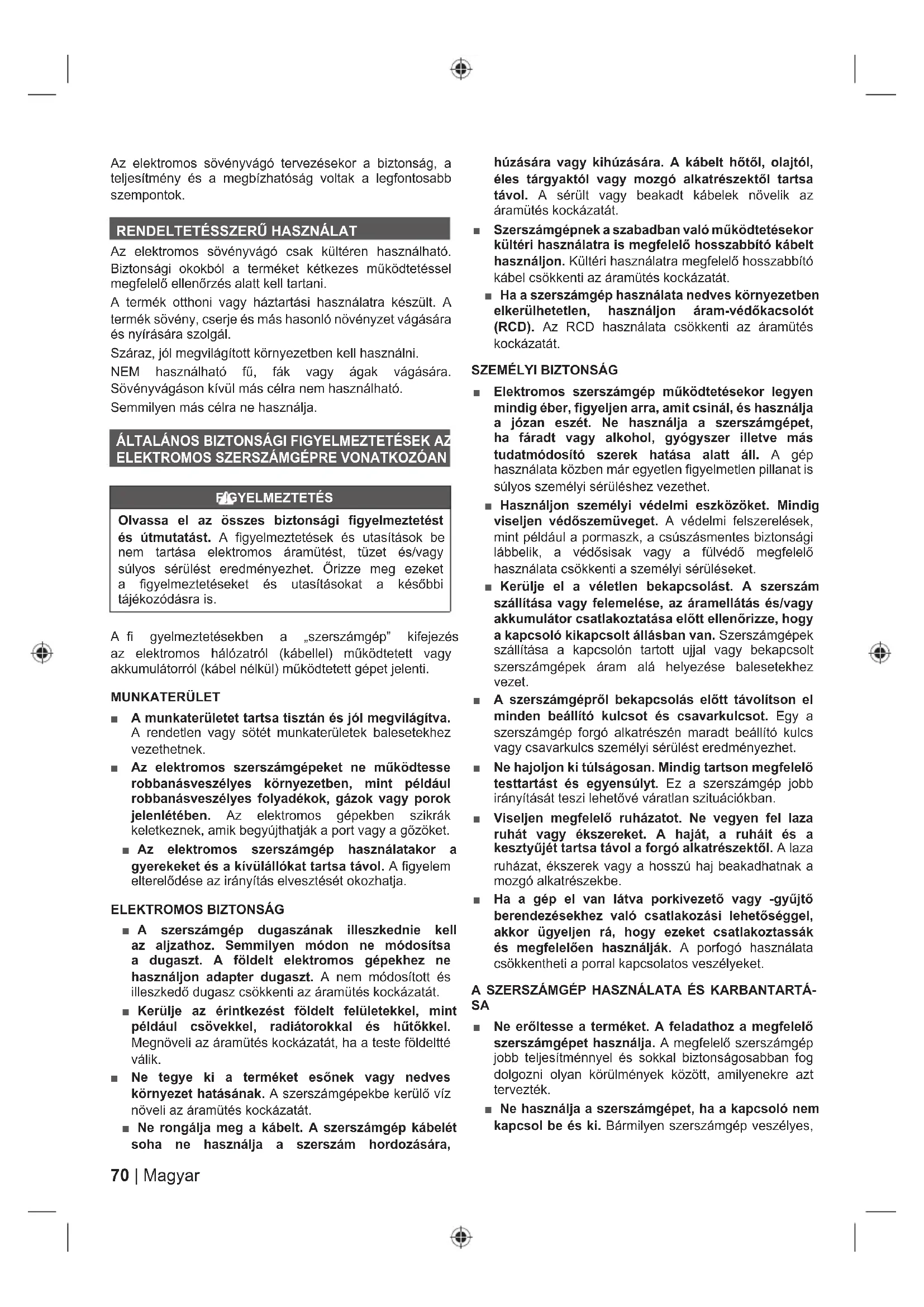 Az elektromos sövényvágó csak kültéren használható. Biztonsági okokból a terméket kétkezes működtetéssel megfelelő ellenőrzés alatt kell tartani. A termék otthoni vagy háztartási használatra készült. A termék sövény, cserje és más hasonló növényzet vágására és nyírására szolgál. Száraz, jól megvilágított környezetben kell használni. NEM használható fű, fák vagy ágak vágására. Sövényvágáson kívül más célra nem használható. Semmilyen más célra ne használja. ÁLTALÁNOS BIZTONSÁGI FIGYELMEZTETÉSEK AZ