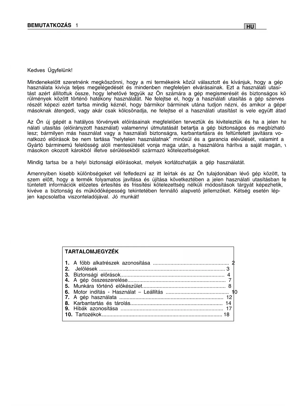 (21BPX078X) V úloze náhradních dílů používejte výhradně výše uvedené řetězy a vodicí lišty. Použití neschválených kombinací může způsobit vážná ublížení na zdraví a škody na stroji. UPOZORNĚNĺ!HU BEMUTATKOZÁS 1 Kedves Ügyfelünk! Mindenekelőtt szeretnénk megköszönni, hogy a mi termékeink közül választott és kívánjuk, hogy a gép használata kivívja teljes megelégedését és mindenben megfeleljen elvárásainak. Ezt a használati utasí- tást azért állítottuk össze, hogy lehetővé tegyük az Ön számára a gép megismerését és biztonságos kö- rülmények között történő hatékony használatát. Ne felejtse el, hogy a használati utasítás a gép szerves részét képezi ezért tartsa mindig kéznél, hogy bármikor bárminek utána tudjon nézni, és amikor a gépet másoknak átengedi, vagy akár csak kölcsönadja, ne felejtse el a használati utasítást is vele együtt átadni. Az Ön új gépét a hatályos törvények előírásainak megfelelően terveztük és kiviteleztük és ha a jelen hasz- nálati utasítás (előirányzott használat) valamennyi útmutatását betartja a gép biztonságos és megbízható lesz; bármilyen más használat vagy a használati biztonságra, karbantartásra és feltüntetett javításra vo- natkozó előírások be nem tartása ”helytelen használatnak” minősül és a garancia elévülését, valamint a Gyártó bárminemű felelősség alóli mentesülését vonja maga után, a használóra hárítva a saját magán, vagy másokon okozott károkból illetve sérülésekből származó kötelezettségeket. Mindig tartsa be a helyi biztonsági előírásokat, melyek korlátozhatják a gép használatát. Amennyiben kisebb különbségeket vél felfedezni az itt leírtak és az Ön tulajdonában lévő gép között, tartsa szem előtt, hogy a termék folyamatos javítása és újítása következtében a jelen használati utasításban fel- tüntetett információk előzetes értesítés és frissítési kötelezettség nélküli módosítások tárgyát képezhetik, kivéve a biztonság és működőképesség tekintetében fennálló alapvető jellemzőket. Kétség esetén lép- jen kapcsolatba viszonteladójával. Jó munkát! TARTALOMJEGYZÉK