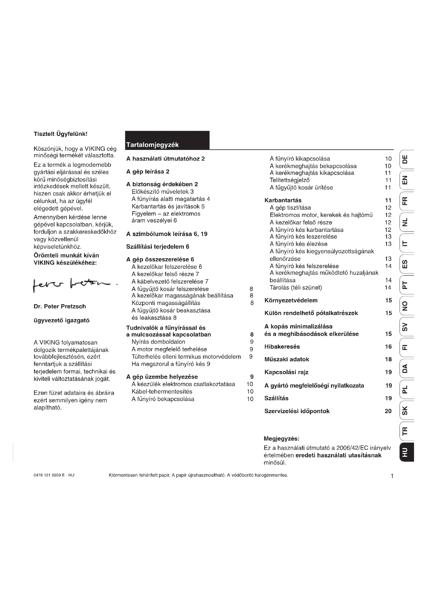 Tisztelt Ügyfelünk! Köszönjük, hogy a VIKING cég minőségi termékét választotta. Ez a termék a legmodernebb gyártási eljárással és széles körű minőségbiztosítási intézkedések mellett készült, hiszen csak akkor érhetjük el célunkat, ha az ügyfél elégedett gépével. Amennyiben kérdése lenne gépével kapcsolatban, kérjük, forduljon a szakkereskedőkhöz vagy közvetlenül képviseletünkhöz. Örömteli munkát kíván VIKING készülékéhez: Dr. Peter Pretzsch ügyvezető igazgató A VIKING folyamatosan dolgozik termékpalettájának továbbfejlesztésén, ezért fenntartjuk a szállítási terjedelem formai, technikai és kiviteli változtatásának jogát. Ezen füzet adataira és ábráira ezért semmilyen igény nem alapítható. Tartalomjegyzék A használati útmutatóhoz 2 A gép leírása 2 A biztonság érdekében 2 Előkészítő műveletek 3 A fűnyírás alatti magatartás 4 Karbantartás és javítások 5 Figyelem – az elektromos áram veszélyei 6 A szimbólumok leírása 6, 19 Szállítási terjedelem 6 A gép összeszerelése 6 A kezelőkar felszerelése 6 A kezelőkar felső része 7 A kábelvezető felszerelése 7 A fűgyűjtő kosár felszerelése 8 A kezelőkar magasságának beállítása 8 Központi magasságállítás 8 A fűgyűjtő kosár beakasztása és leakasztása 8 Tudnivalók a fűnyírással és a mulcsozással kapcsolatban 8 Nyírás domboldalon 9 A motor megfelelő terhelése 9 Túlterhelés elleni termikus motorvédelem 9 Ha megszorul a fűnyíró kés 9 A gép üzembe helyezése 9 A készülék elektromos csatlakoztatása 10 Kábel-tehermentesítés 10 A fűnyíró bekapcsolása 10 A fűnyíró kikapcsolása 10 A kerékmeghajtás bekapcsolása 10 A kerékmeghajtás kikapcsolása 11 Telítettségjelző 11 A fűgyűjtő kosár ürítése 11 Karbantartás 11 A gép tisztítása 12 Elektromos motor, kerekek és hajtómű 12 A kezelőkar felső része 12 A fűnyíró kés karbantartása 12 A fűnyíró kés leszerelése 13 A fűnyíró kés élezése 13 A fűnyíró kés kiegyensúlyozottságának ellenőrzése 13 A fűnyíró kés felszerelése 14 A kerékmeghajtás működtető huzaljának beállítása 14 Tárolás (téli szünet) 14 Környezetvédelem 15 Külön rendelhető pótalkatrészek 15 A kopás minimalizálása és a meghibásodások elkerülése 15 Hibakeresés 16 Műszaki adatok 18 Kapcsolási rajz 19 A gyártó megfelelőségi nyilatkozata 19 Szállítás 19 Szervizelési időpontok 20 Megjegyzés: Ez a használati útmutató a 2006/42/EC irányelv értelmében eredeti használati utasításnak minősül. Klórmentesen fehérített papír. A papír újrahasznosítható. A védőborító halogénmentes.