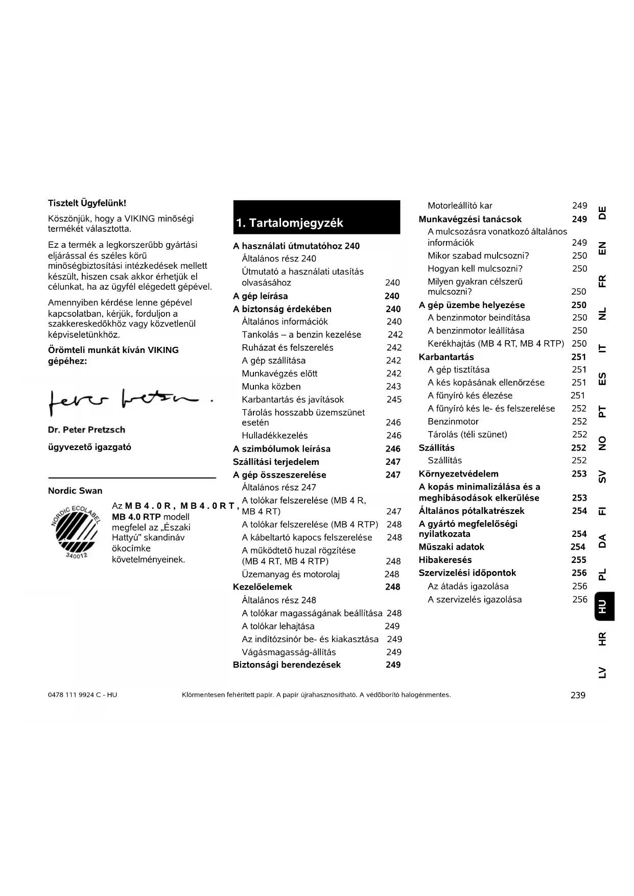 DEENFRNLITESPTNOSVFIDAPLHRLV HU 0478 111 9924 C - HU Tisztelt Ügyfelünk! Köszönjük, hogy a VIKING minőségi termékét választotta. Ez a termék a legkorszerűbb gyártási eljárással és széles körű minőségbiztosítási intézkedések mellett készült, hiszen csak akkor érhetjük el célunkat, ha az ügyfél elégedett gépével. Amennyiben kérdése lenne gépével kapcsolatban, kérjük, forduljon a szakkereskedőkhöz vagy közvetlenül képviseletünkhöz. Örömteli munkát kíván VIKING gépéhez: ügyvezető igazgató Nordic Swan Az MB4.0R, MB4.0RT, MB 4.0 RTP modell megfelel az „Északi Hattyú” skandináv ökocímke követelményeinek. Klórmentesen fehérített papír. A papír újrahasznosítható. A védőborító halogénmentes.