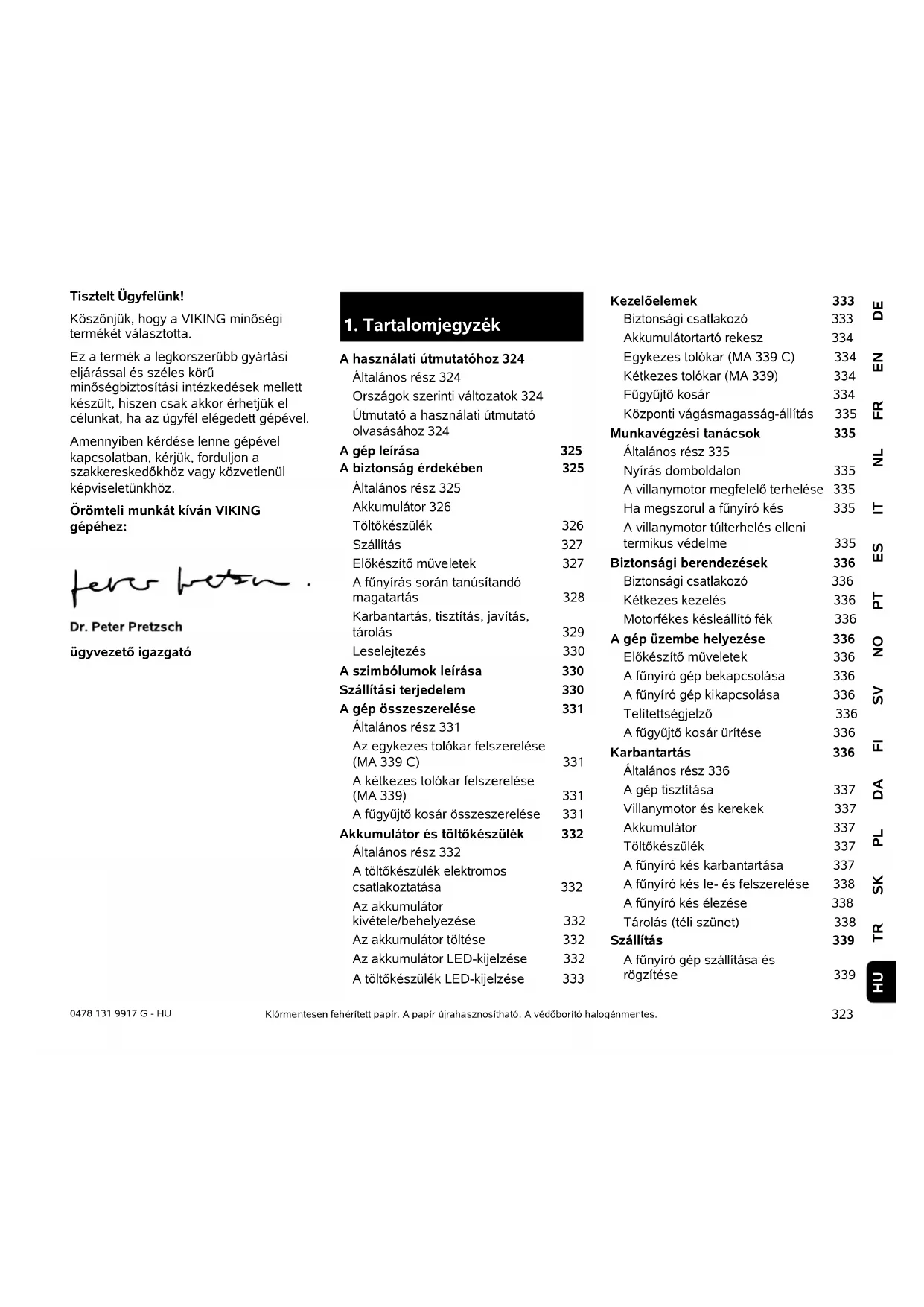DEENFRNLITESPTNOSVFIDAPLSKTRHU 0478 131 9917 G - HU Tisztelt Ügyfelünk! Köszönjük, hogy a VIKING minőségi termékét választotta. Ez a termék a legkorszerűbb gyártási eljárással és széles körű minőségbiztosítási intézkedések mellett készült, hiszen csak akkor érhetjük el célunkat, ha az ügyfél elégedett gépével. Amennyiben kérdése lenne gépével kapcsolatban, kérjük, forduljon a szakkereskedőkhöz vagy közvetlenül képviseletünkhöz. Örömteli munkát kíván VIKING gépéhez: ügyvezető igazgató Klórmentesen fehérített papír. A papír újrahasznosítható. A védőborító halogénmentes.