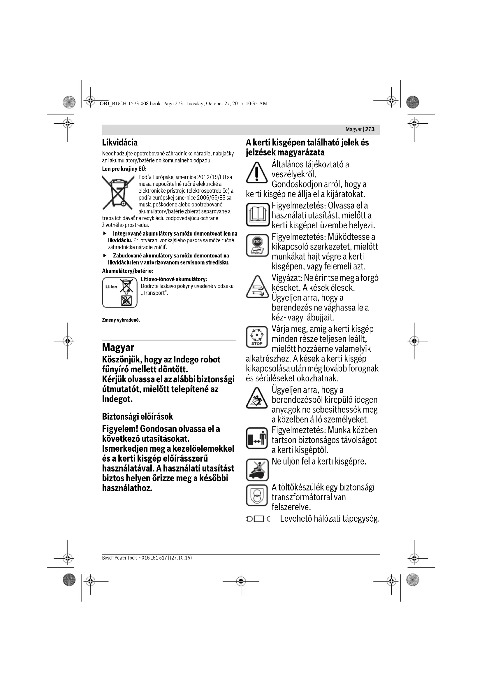 egyedi nyírási napok és időablakok beállításával. Kijelölés Aktivizálja az 5 egyedi időterv egyikét. Időterv-infó Magyarázat Időterv-infó A programozott fűnyírási napok áttekintése Vissza Vissza a főmenühöz. Időterv kijelölése Belépés az „Időterv kijelölés” menübe. Gombok reteszelése Magyarázat Gombok reteszelése A gombok az automatikus reteszeléstől függetlenül azonnal reteszelésre kerülnek. Gombok feloldása A gombok reteszelésének feloldásához meg kell adni a PIN-kódot. Beállítások Magyarázat OBJ_BUCH-1573-008.book Page 287 Tuesday, October 27, 2015 10:35 AM288 | Magyar F 016 L81 517 | (27.10.15) Bosch Power Tools Hibakeresés Online Support http://www.bosch-indego.com Probléma Lehetséges ok Elhárítás módja A kerti kisgép nem működik Eltömődés lehetséges Ellenőrizze és szükség esetén tegye szabaddá a kerti kisgép alsó részét (viseljen mindig kerti védőkesztyűt) Az akkumulátor nincs teljesen feltöltve A kerti kisgép behelyezése a töltéshez a töltőállomásba A fű túl hosszú Állítsa be nagyobbra a vágási magasságot Az akkumulátor túl hideg/túl meleg Hagyja a felmelegedni/lehűlni az akkumulátort Az áramkör megszakító nincs helyesen/ teljesen behelyezve Helyezze be helyesen A motor elindul, majd azonnal ismét leáll Az akkumulátor nincs teljesen feltöltve A kerti kisgép behelyezése a töltéshez a töltőállomásba Az áramkör megszakító nincs helyesen/ teljesen behelyezve Helyezze be helyesen Az akkumulátor túl hideg/túl meleg Hagyja a felmelegedni/lehűlni az akkumulátort Állítsa be nagyobbra a vágási magasságot A kerti kisgép csak megszakításokkal működik Belső hiba lehetséges Forduljon egy erre feljogosított Bosch vevőszolgálathoz A kerti kisgép egyenetlen vágási mintát hoz létre A vágási magasság túl alacsony Állítsa be nagyobbra a vágási magasságot A kés eltompult Késcsere Eltömődés lehetséges Ellenőrizze és szükség esetén tegye szabaddá a kerti kisgép alsó részét (viseljen mindig kerti védőkesztyűt) A gyep részben nincs lenyírva Az időablak túl kicsi a gyep méreteihez képest Növelje meg az időablakot Az akkumulátor élettartama Forduljon egy erre feljogosított Bosch vevőszolgálathoz A távolság a határoló vezetékek által körülvett akadályok között kisebb mint 1 m Növelje meg a határoló vezetékek közötti távolságot Figyelem: A 6 cm-nél magasabb akadályokat nem kell vezetékkel körülvenni Göröngyös gyep A Fűnyírási beállítások menüben növelje meg/ csökkentse le a nyírási sávok átfedését Erős rezgések/zajok A késrögzítő anya/csavar kilazult Húzza meg szorosra a késrögzítő anyát/csavart A kés megrongálódott Késcsere Az akkumulátor nem töltődik A töltőérintkezők megrozsdásodtak Tisztítsa meg a töltőérintkezőket Belső hiba lehetséges Forduljon egy erre feljogosított Bosch vevőszolgálathoz A kerti kisgép nem tud eljutni a töltőállomáshoz A határoló vezeték nincs helyesen beállítva Ellenőrizze és állítsa be helyesen a határoló vezetéket A határoló vezeték egy zavarforrás közelében van Biztosítson elegendő távolságot a határoló vezeték és a zavarforrás között (kb. 1 m) OBJ_BUCH-1573-008.book Page 288 Tuesday, October 27, 2015 10:35 AMMagyar | 289 Bosch Power Tools F 016 L81 517 | (27.10.15) Vevőszolgálat és használati tanácsadás www.bosch-garden.com Ha kérdései vannak vagy pótalkatrészeket akar megrendelni, okvetlenül adja meg a kerti kisgép típustábláján található 10- jegyű megrendelési számot. Ha szükséges, a fűnyíró robotot és a töltőállomást mindig együtt küldje be a Bosch szervizközpontba. Szükség lehet az Ön kerti kisgépének szoftver verzió számára is (lásd „Menü > Beállítások > Rendszer-beállítások > Infó”). Magyarország Robert Bosch Kft. 1103 Budapest Gyömrői út. 120. A www.bosch-pt.hu oldalon online megrendelheti készülékének javítását. Tel.: (061) 431-3835 Fax: (061) 431-3888 Szállítás A termékben található lithium-ion-akkumulátorokra a veszélyes árukra vonatkozó előírások érvényesek. A felhasználók az akkumulátorokat a közúti szállításban minden további nélkül szállíthatják. Ha az akkumulátorok szállításával harmadik személyt (például: légi vagy egyéb szállító vállalatot) bíznak meg, akkor figyelembe kell venni a csomagolásra és a megjelölésre vonatkozó különleges követelményeket. Ebben az esetben a küldemény előkészítésébe be kell vonni egy veszélyes áru szakembert. Hulladékkezelés Ne dobja ki a kerti kisgépeket, töltőkészülékeket és az akkumulátorokat/elemeket a háztartási szemétbe! Csak az EU-tagországok számára: Az elhasznált villamos és elektronikus berendezésekre vonatkozó 2012/19/EU európai irányelvnek és az elromlott vagy elhasznált akkumulátorokra/elemekre vonatkozó 2006/66/EK európai irányelvnek megfelelően a már nem használható akkumulátorokat/elemeket külön össze kell gyűjteni és a környezetvédelmi szempontoknak megfelelően kell újrafelhasználásra leadni. A beépített akkumulátorokat csak a hulladékba való eltávolításhoz szabad kivenni. A ház felnyitásakor a kerti kisgép tönkremehet. A beépített akkumulátorokat a hulladékkezelés céljából csak egy vevőszolgálat szerelheti ki. Akkumulátorok/elemek: Li-ion: Kérjük vegye figyelembe a „Szállítás” fejezetben leírtakat. A változtatások joga fenntartva. A töltőállomás LED-je villog A határoló vezeték megszakadt, túl hosszú vagy túl rövid Ellenőrizze, hogy a határoló vezeték nincs megszakadva és a hossza 20 m és 450 m között van. Ezután kapcsolja ki, majd kapcsolja ismét be a feszültségellátást. A töltőállomás kijelzője nem világít A tápegység hálózati csatlakozó dugója nincs (helyesen) bedugva Dugja be 