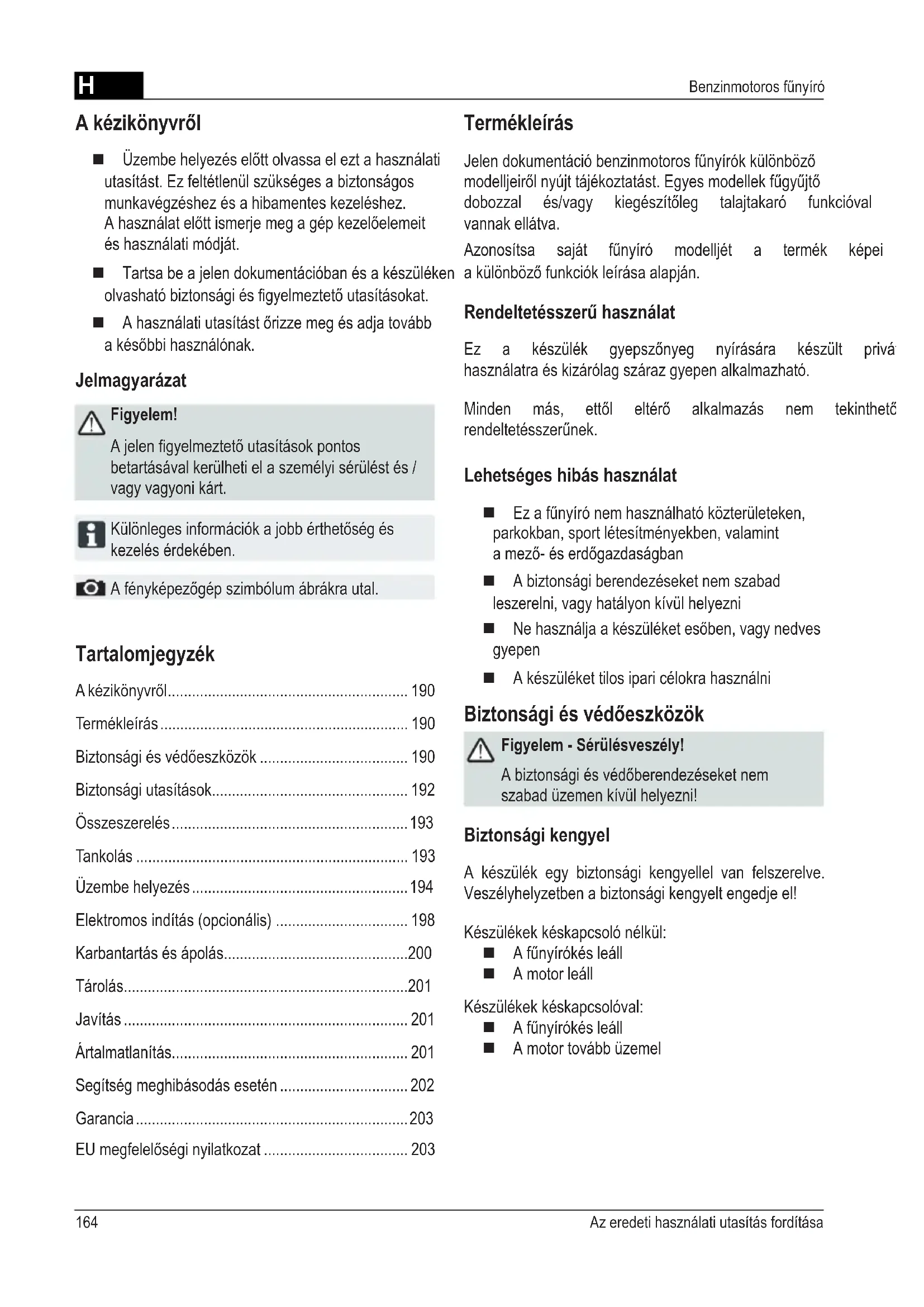 - Benzinmotoros fűnyíró Tartalomjegyzék Akézikönyvről p. 190