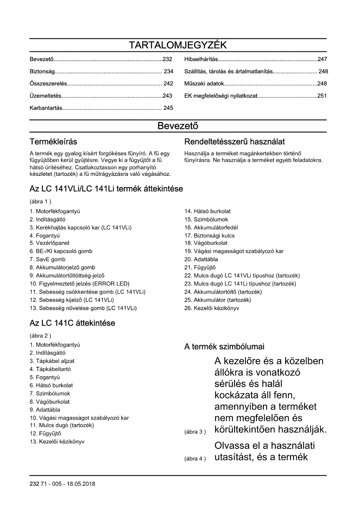 - EK megfelelőségi nyilatkozat Bevezető Termékleírás A termék egy gyalog kísért forgókéses fűnyíró. A fű egy fűgyűjtőben kerül gyűjtésre. Vegye ki a fűgyűjtőt a fű hátsó ürítéséhez. Csatlakoztasson egy porhanyító készletet (tartozék) a fű műtrágyázásra való vágásához. Rendeltetésszerű használat Használja a terméket magánkertekben történő fűnyírásra. Ne használja a terméket egyéb feladatokra. Az LC 141VLi/LC 141Li termék áttekintése (ábra 1 ) p. 251