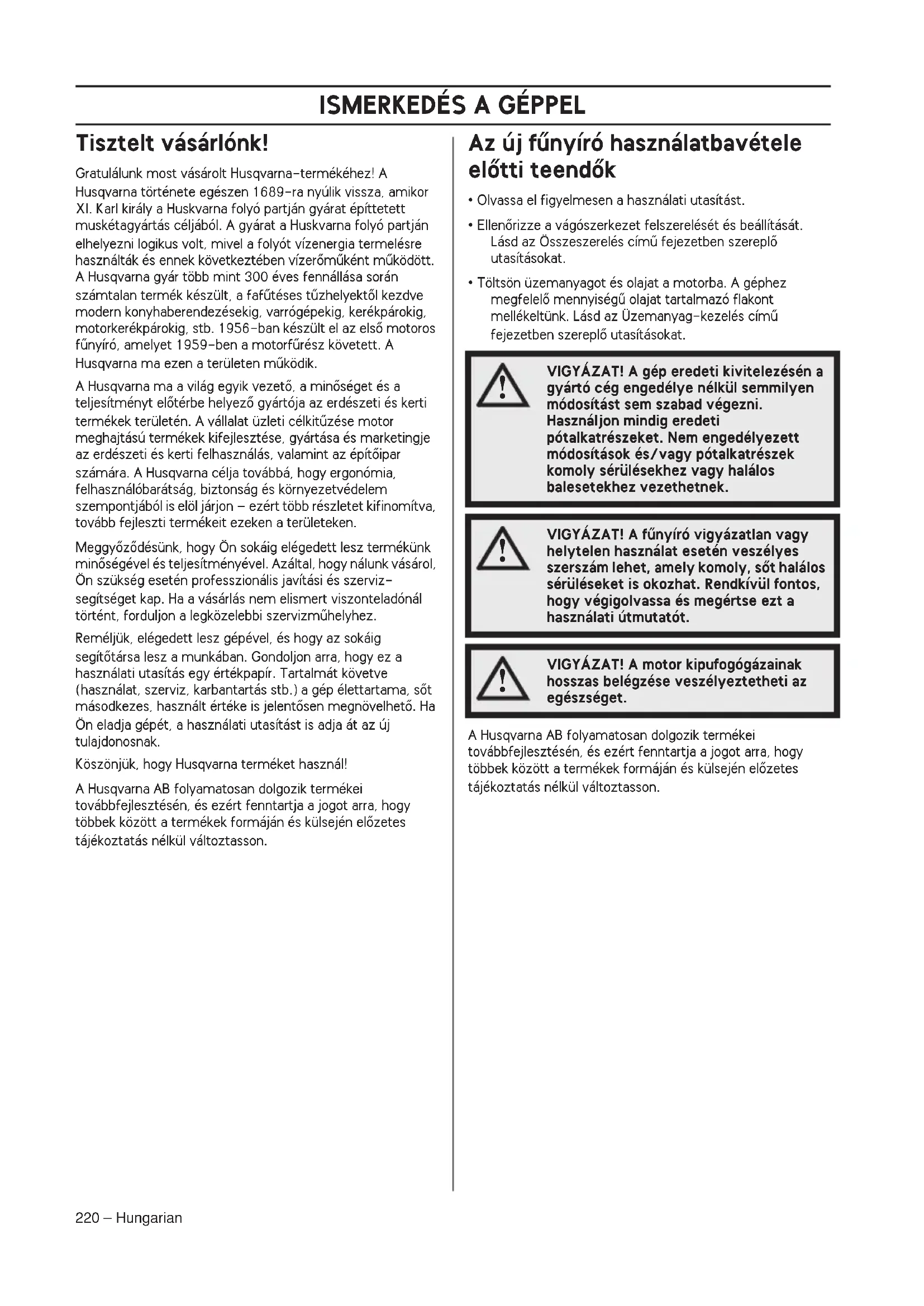 Mıszaki adatok ........................................................... 233 Termékazonossági EGK-bizonyítvány ........................ 235ISMERKEDÉS A GÉPPEL 220 – Hungarian Tisztelt vásárlónk! Gratulálunk most vásárolt Husqvarna-termékéhez! A Husqvarna története egészen 1689-ra nyúlik vissza, amikor