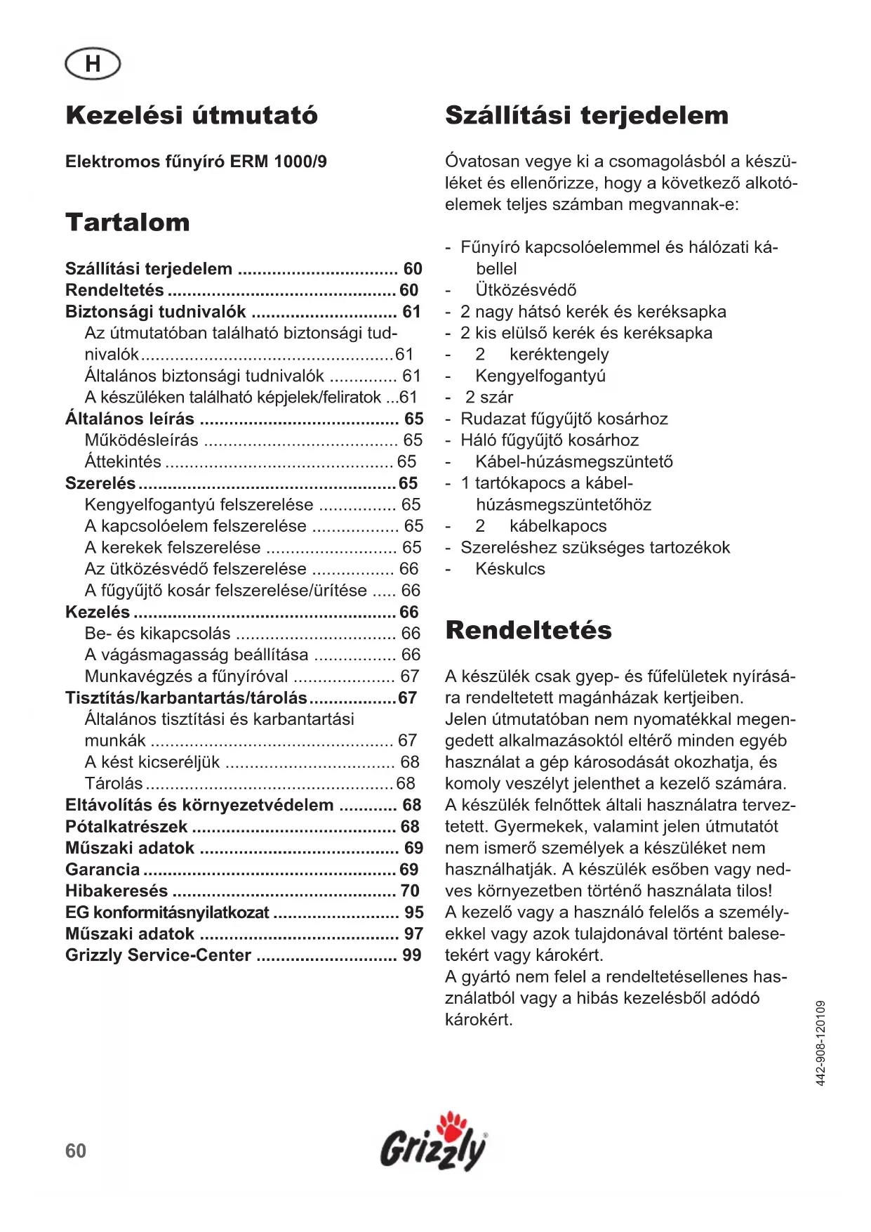 - Grizzly Service-Center Kezelési útmutató Elektromos fűnyíró ERM 1000/9 Szállítási terjedelem Óvatosan vegye ki a csomagolásból a készü- léket és ellenőrizze, hogy a következő alkotó- elemek teljes számban megvannak-e: - Fűnyíró kapcsolóelemmel és hálózati ká- bellel - Ütközésvédő - 2 nagy hátsó kerék és keréksapka - 2 kis elülső kerék és keréksapka - 2 keréktengely - Kengyelfogantyú - 2 szár - Rudazat fűgyűjtő kosárhoz - Háló fűgyűjtő kosárhoz - Kábel-húzásmegszüntető - 1 tartókapocs a kábel- húzásmegszüntetőhöz - 2 kábelkapocs - Szereléshez szükséges tartozékok - Késkulcs Rendeltetés A készülék csak gyep- és fűfelületek nyírásá- ra rendeltetett magánházak kertjeiben. Jelen útmutatóban nem nyomatékkal megen- gedett alkalmazásoktól eltérő minden egyéb használat a gép károsodását okozhatja, és komoly veszélyt jelenthet a kezelő számára. A készülék felnőttek általi használatra tervez- tetett. Gyermekek, valamint jelen útmutatót nem ismerő személyek a készüléket nem használhatják. A készülék esőben vagy ned- ves környezetben történő használata tilos! A kezelő vagy a használó felelős a személy- ekkel vagy azok tulajdonával történt balese- tekért vagy károkért. A gyártó nem felel a rendeltetésellenes has- ználatból vagy a hibás kezelésből adódó károkért.61 p. 99