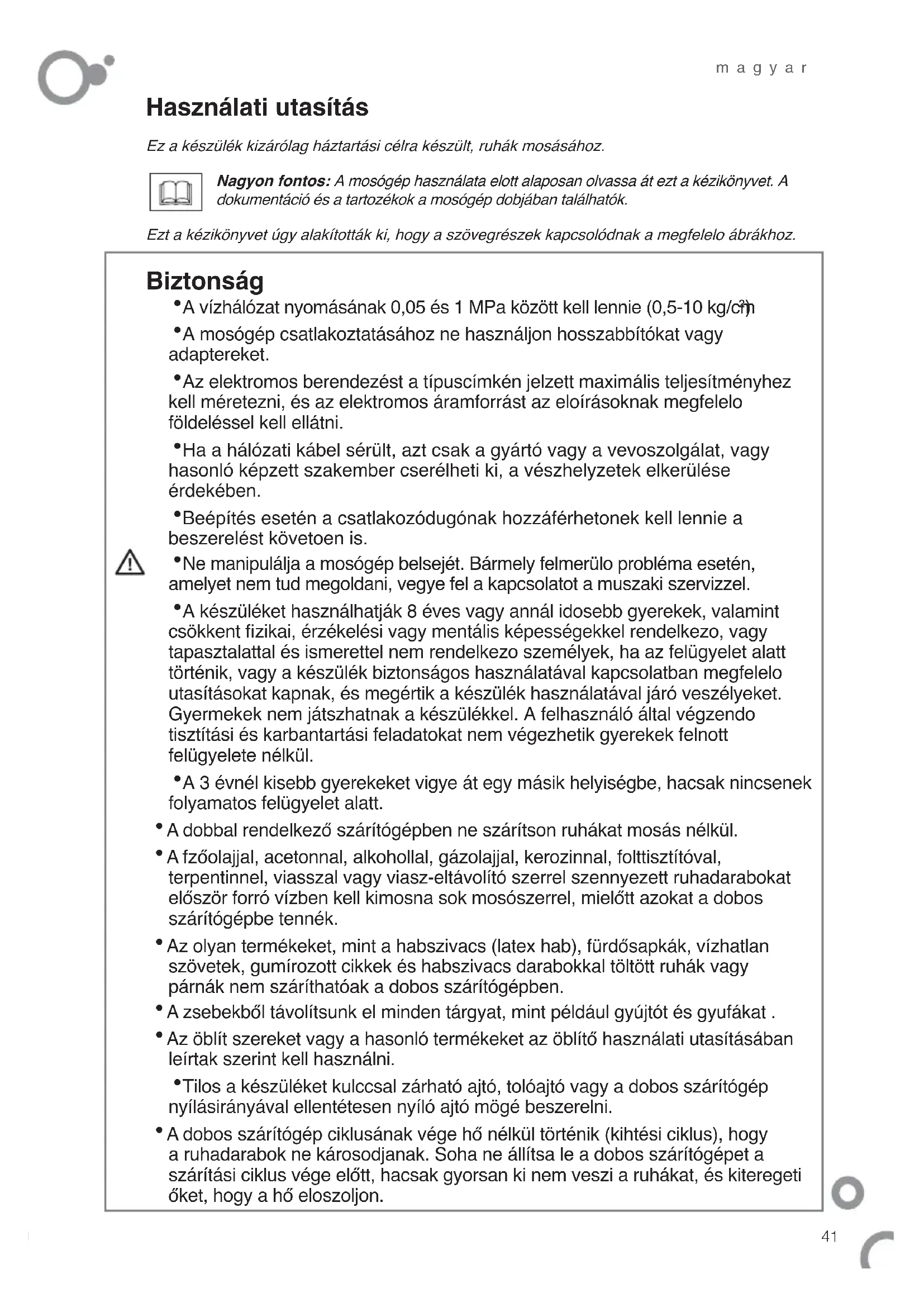 - A dobos szárítógép ciklusának vége hő nélkül történik (kihtési ciklus), hogy a ruhadarabok ne károsodjanak. Soha ne állítsa le a dobos szárítógépet a szárítási ciklus vége előtt, hacsak gyorsan ki nem veszi a ruhákat, és kiteregeti őket, hogy a hő eloszoljon. Ez a készülék kizárólag háztartási célra készült, ruhák mosásához. Nagyon fontos: A mosógép használata elott alaposan olvassa át ezt a kézikönyvet. A dokumentáció és a tartozékok a mosógép dobjában találhatók. Ezt a kézikönyvet úgy alakították ki, hogy a szövegrészek kapcsolódnak a megfelelo ábrákhoz. Biztonság42 magyar