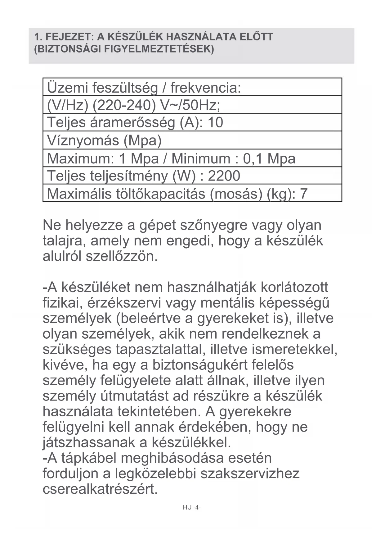 Üzemi feszültség / frekvencia: (V/Hz) (220-240) V~/50Hz; Teljes áramerősség (A): 10 Víznyomás (Mpa) Maximum: 1 Mpa / Minimum : 0,1 Mpa Teljes teljesítmény (W) : 2200 Maximális töltőkapacitás (mosás) (kg): 7 Ne helyezze a gépet szőnyegre vagy olyan talajra, amely nem engedi, hogy a készülék alulról szellőzzön. -A készüléket nem használhatják korlátozott zikai, érzékszervi vagy mentális képességű személyek (beleértve a gyerekeket is), illetve olyan személyek, akik nem rendelkeznek a szükséges tapasztalattal, illetve ismeretekkel, kivéve, ha egy a biztonságukért felelős személy felügyelete alatt állnak, illetve ilyen személy útmutatást ad részükre a készülék használata tekintetében. A gyerekekre felügyelni kell annak érdekében, hogy ne játszhassanak a készülékkel. -A tápkábel meghibásodása esetén forduljon a legközelebbi szakszervizhez cserealkatrészért.
