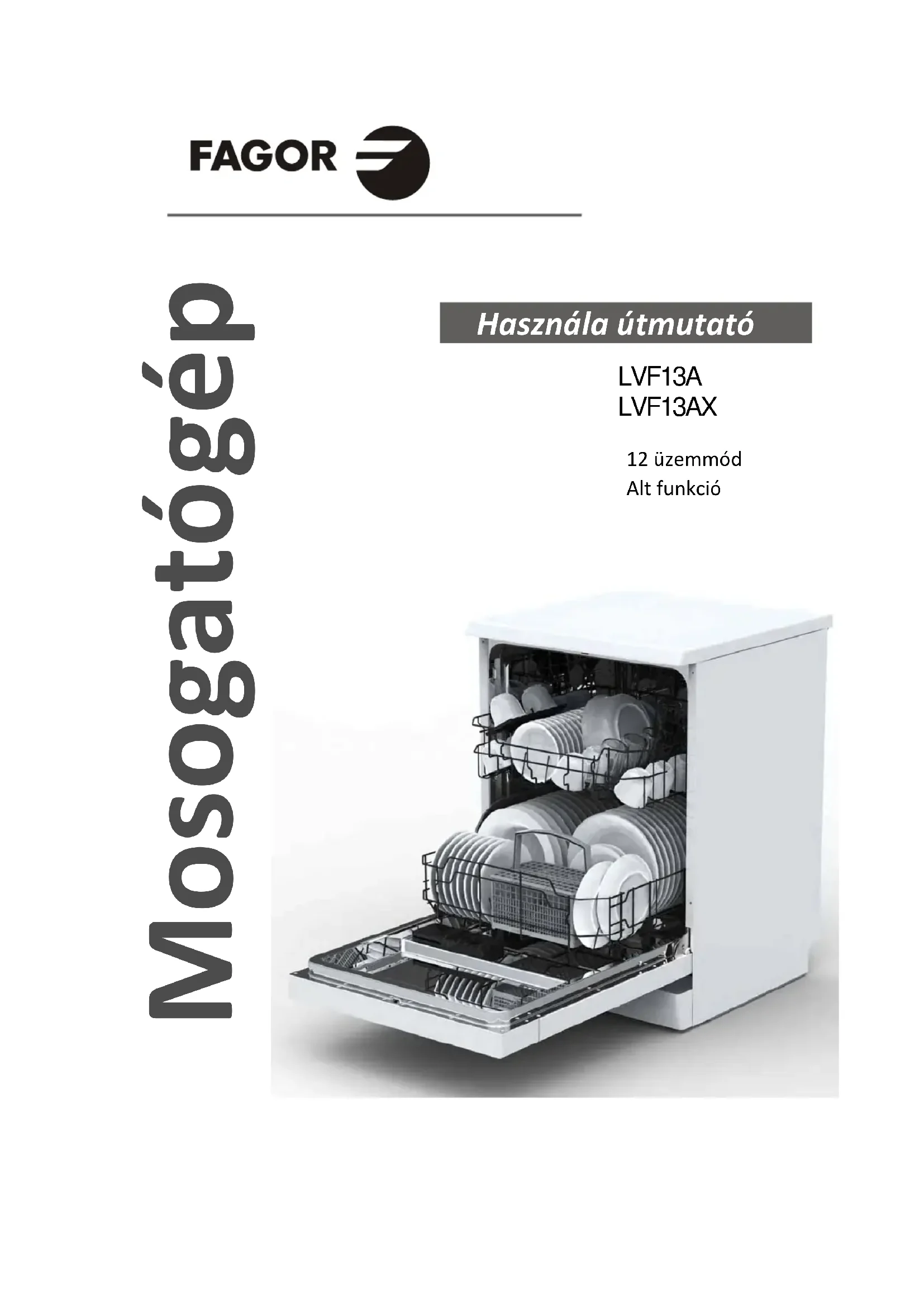 12 üzemmód Alt funkció Mosogatógép LVF13A LVF13AXOlvassa el ezt a használati útmutatót Tisztelt Vásárlónk! Kérjük, a mosogatógép használata előtt figyelmesen olvassa el ezt a használati útmutatót, mert segítséget nyújt a gép megfelelő használatában és karbantartásában. Őrizze meg az útmutatót, hogy később is használni tudja. Adja át a mosogatógép következő tulajdonosának. Ez a kézikönyv a "Biztonsági óvintézkedések", a "Használati utasítások", a "Telepítés", valamint a "Hibaelhárítás" stb. fejezeteket tartalmazza. Mielőtt a szervizhez fordul A "Hibaelhárítás" című fejezet segít Önnek, hogy néhány gyakori problémát saját maga megoldjon. Ha a problémát nem tudja egyedül elhárítani, kérjük, vegye igénybe egy képzett szakember segítségét. MEGJEGYZÉS: A gyártó folyamatosan fejleszti a terméket, melyen előzetes értesítés nélkül módosításokat hajthat végre. Ezt a használati utasítást a gyártótól vagy a megbízott forgalmazótól kell megkapnia.