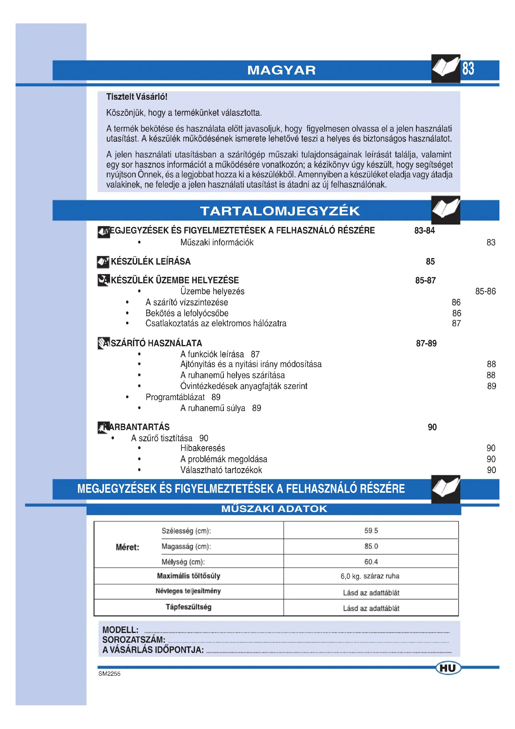 Aby ste získali viac priestoru, predajca Vám môže poskytnúť súpravu, ktorá Vám umožní nainštalovať sušičku na práčku, ktorá má dvierka na vkladanie bielizne vpredu. Zodpovedný pracovník Vám poskytne informácie o modeloch spotrebiča, na ktorý možno túto súpravu namontovať.83 SM2255 TARTALOMJEGYZÉK MODELL: ............................................................................................................................................................................................................ SOROZATSZÁM: ............................................................................................................................................................................................ A VÁSÁRLÁS IDŐPONTJA: .................................................................................................................................................................... MAGYAR Tisztelt Vásárló! Köszönjük, hogy a termékünket választotta. A termék bekötése és használata előtt javasoljuk, hogy figyelmesen olvassa el a jelen használati utasítást. A készülék működésének ismerete lehetővé teszi a helyes és biztonságos használatot. A jelen használati utasításban a szárítógép műszaki tulajdonságainak leírását találja, valamint egy sor hasznos információt a működésére vonatkozón; a kézikönyv úgy készült, hogy segítséget nyújtson Önnek, és a legjobbat hozza ki a készülékből. Amennyiben a készüléket eladja vagy átadja valakinek, ne feledje a jelen használati utasítást is átadni az új felhasználónak.