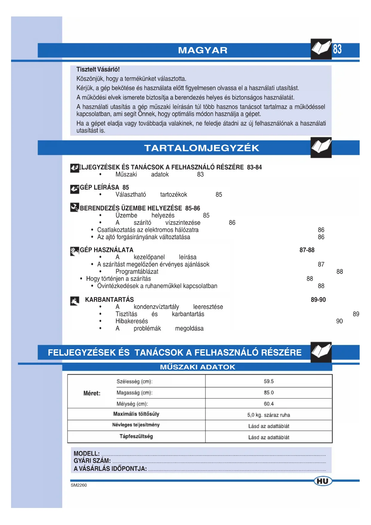 ▼ Otočte 3 páčky do vertikálnej polohy a vyberte kondenzátor (obr. 16). ▼ Kondenzátor umyte spredu, zozadu a po bokoch, pričom smer vody nasmerujte ako je zobrazené (obr. 17/18). Aby kondenzátor dokonale odkvapkal, oprite ho jednou stranou na uterák. ▼ Keď sa dobre osušil, namontujte ho späť, vyko- najte kroky v opačnom poradí. SK83 SM2260 TARTALOMJEGYZÉK MODELL: ................................................................................................................................................................................................................ GYÁRI SZÁM: ...................................................................................................................................................................................................... A VÁSÁRLÁS IDŐPONTJA: ..................................................................................................................................................................... Tisztelt Vásárló! Köszönjük, hogy a termékünket választotta. Kérjük, a gép bekötése és használata előtt figyelmesen olvassa el a használati utasítást. A működési elvek ismerete biztosítja a berendezés helyes és biztonságos használatát. A használati utasítás a gép műszaki leírásán túl több hasznos tanácsot tartalmaz a működéssel kapcsolatban, ami segít Önnek, hogy optimális módon használja a gépet. Ha a gépet eladja vagy továbbadja valakinek, ne feledje átadni az új felhasználónak a használati utasítást is.