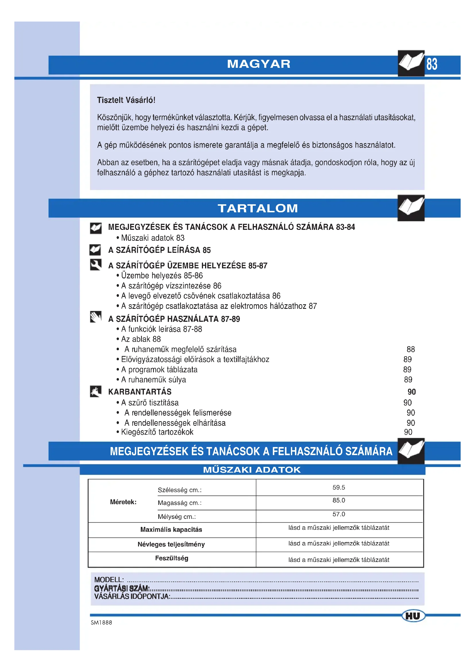 - Mıszaki adatok 83 A SZÁRÍTÓGÉP LEÍRÁSA 85 A SZÁRÍTÓGÉP ÜZEMBE HELYEZÉSE 85-87