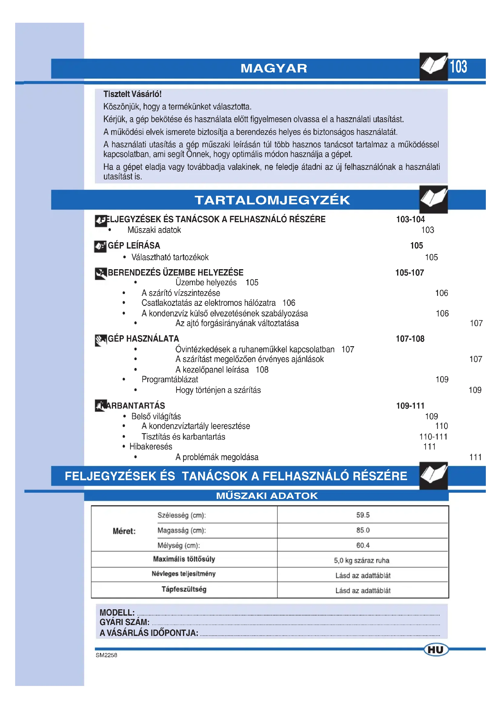 SM2258 POZNÁMKY103 SM2258 TARTALOMJEGYZÉK MODELL: ................................................................................................................................................................................................................ GYÁRI SZÁM: ...................................................................................................................................................................................................... A VÁSÁRLÁS IDŐPONTJA: ..................................................................................................................................................................... Tisztelt Vásárló! Köszönjük, hogy a termékünket választotta. Kérjük, a gép bekötése és használata előtt figyelmesen olvassa el a használati utasítást. A működési elvek ismerete biztosítja a berendezés helyes és biztonságos használatát. A használati utasítás a gép műszaki leírásán túl több hasznos tanácsot tartalmaz a működéssel kapcsolatban, ami segít Önnek, hogy optimális módon használja a gépet. Ha a gépet eladja vagy továbbadja valakinek, ne feledje átadni az új felhasználónak a használati utasítást is.