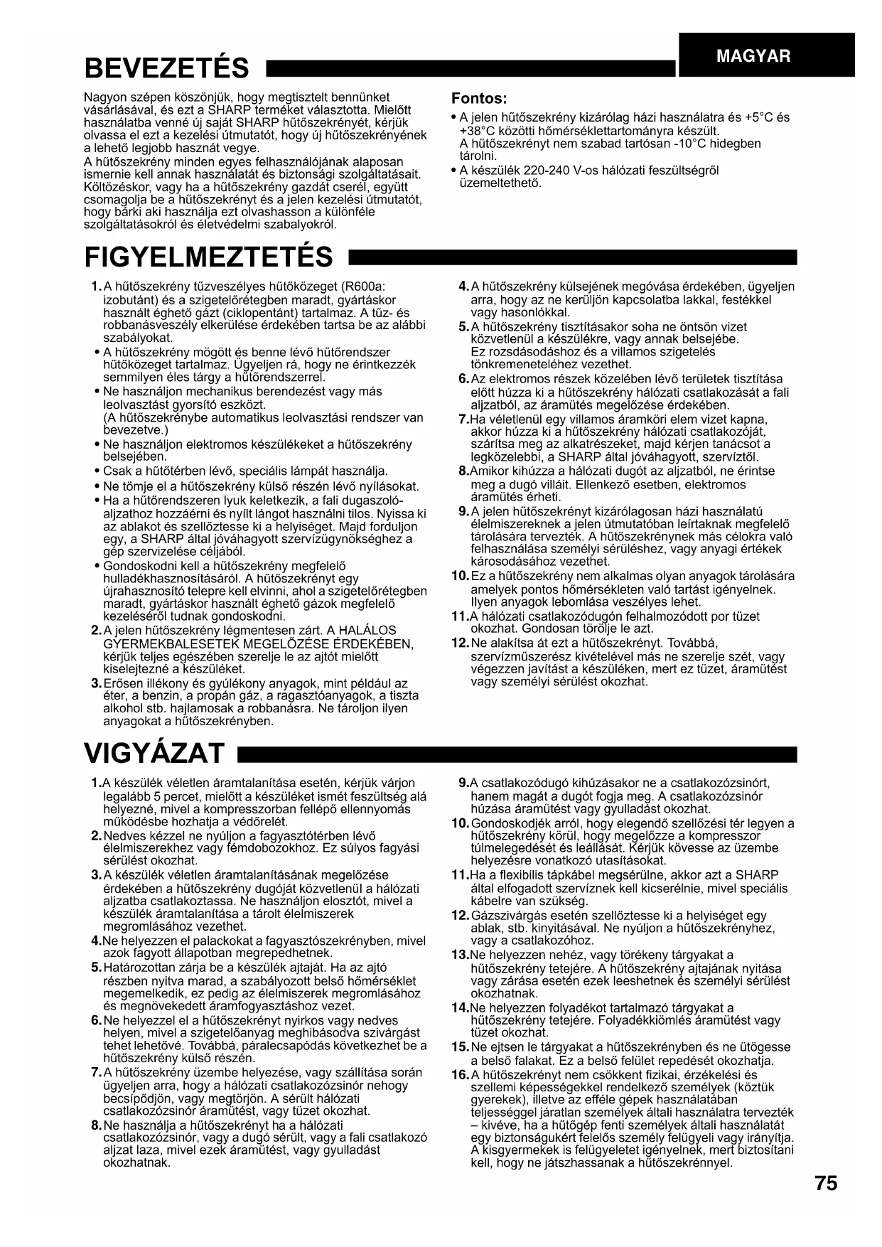 - Gondoskodni kell a hűtőszekrény megfelelő hulladékhasznosításáról. A hűtőszekrényt egy újrahasznosító telepre kell elvinni, ahol a szigetelőrétegben maradt, gyártáskor használt éghető gázok megfelelő kezeléséről tudnak gondoskodni. 2.A jelen hűtőszekrény légmentesen zárt. A HALÁLOS GYERMEKBALESETEK MEGELŐZÉSE ÉRDEKÉBEN, kérjük teljes egészében szerelje le az ajtót mielőtt kiselejtezné a készüléket. 3.Erősen illékony és gyúlékony anyagok, mint például az éter, a benzin, a propán gáz, a ragasztóanyagok, a tiszta alkohol stb. hajlamosak a robbanásra. Ne tároljon ilyen anyagokat a hűtőszekrényben. 4.A hűtőszekrény külsejének megóvása érdekében, ügyeljen arra, hogy az ne kerüljön kapcsolatba lakkal, festékkel vagy hasonlókkal. 5.A hűtőszekrény tisztításakor soha ne öntsön vizet közvetlenül a készülékre, vagy annak belsejébe. Ez rozsdásodáshoz és a villamos szigetelés tönkremeneteléhez vezethet. 6.Az elektromos részek közelében lévő területek tisztítása előtt húzza ki a hűtőszekrény hálózati csatlakozását a fali aljzatból, az áramütés megelőzése érdekében. 7.Ha véletlenül egy villamos áramköri elem vizet kapna, akkor húzza ki a hűtőszekrény hálózati csatlakozóját, szárítsa meg az alkatrészeket, majd kérjen tanácsot a legközelebbi, a SHARP által jóváhagyott, szervíztől. 8.Amikor kihúzza a hálózati dugót az aljzatból, ne érintse meg a dugó villáit. Ellenkező esetben, elektromos áramütés érheti. 9.A jelen hűtőszekrényt kizárólagosan házi használatú élelmiszereknek a jelen útmutatóban leírtaknak megfelelő tárolására tervezték. A hűtőszekrénynek más célokra való felhasználása személyi sérüléshez, vagy anyagi értékek károsodásához vezethet. 10.Ez a hűtőszekrény nem alkalmas olyan anyagok tárolására amelyek pontos hőmérsékleten való tartást igényelnek. Ilyen anyagok lebomlása veszélyes lehet.11.A hálózati csatlakozódugón felhalmozódott por tüzet okozhat. Gondosan törölje le azt. 12.Ne alakítsa át ezt a hűtőszekrényt. Továbbá, szervízműszerész kivételével más ne szerelje szét, vagy végezzen javítást a készüléken, mert ez tüzet, áramütést vagy személyi sérülést okozhat. VIGYÁZAT 1.A készülék véletlen áramtalanítása esetén, kérjük várjon legalább 5 percet, mielőtt a készüléket ismét feszültség alá helyezné, mivel a kompresszorban fellépő ellennyomás működésbe hozhatja a védőrelét. 2.Nedves kézzel ne nyúljon a fagyasztótérben lévő élelmiszerekhez vagy fémdobozokhoz. Ez súlyos fagyási sérülést okozhat. 3.A készülék véletlen áramtalanításának megelőzése érdekében a hűtőszekrény dugóját közvetlenül a hálózati aljzatba csatlakoztassa. Ne használjon elosztót, mivel a készülék áramtalanítása a tárolt élelmiszerek megromlásához vezethet. 4.Ne helyezzen el palackokat a fagyasztószekrényben, mivel azok fagyott állapotban megrepedhetnek. 5.Határozottan zárja be a készülék ajtaját. Ha az ajtó részben nyitva marad, a szabályozott belső hőmérséklet megemelkedik, ez pedig az élelmiszerek megromlásához és megnövekedett áramfogyasztáshoz vezet. 6.Ne helyezzel el a hűtőszekrényt nyirkos vagy nedves helyen, mivel a szigetelőanyag meghibásodva szivárgást tehet lehetővé. Továbbá, páralecsapódás következhet be a hűtőszekrény külső részén. 7.A hűtőszekrény üzembe helyezése, vagy szállítása során ügyeljen arra, hogy a hálózati csatlakozózsinór nehogy becsípődjön, vagy megtörjön. A sérült hálózati csatlakozózsinór áramütést, vagy tüzet okozhat. 8.Ne használja a hűtőszekrényt ha a hálózati csatlakozózsinór, vagy a dugó sérült, vagy a fali csatlakozó aljzat laza, mivel ezek áramütést, vagy gyulladást okozhatnak. 9.A csatlakozódugó kihúzásakor ne a csatlakozózsinórt, hanem magát a dugót fogja meg. A csatlakozózsinór húzása áramütést vagy gyulladást okozhat. 10.Gondoskodjék arról, hogy elegendő szellőzési tér legyen a hűtőszekrény körül, hogy megelőzze a kompresszor túlmelegedését és leállását. Kérjük kövesse az üzembe helyezésre vonatkozó utasításokat.11.Ha a flexibilis tápkábel megsérülne, akkor azt a SHARP által elfogadott szervíznek kell kicserélnie, mivel speciális kábelre van szükség. 12.Gázszivárgás esetén szellőztesse ki a helyiséget egy ablak, stb. kinyitásával. Ne nyúljon a hűtőszekrényhez, vagy a csatlakozóhoz.13.Ne helyezzen nehéz, vagy törékeny tárgyakat a hűtőszekrény tetejére. A hűtőszekrény ajtajának nyitása vagy zárása esetén ezek leeshetnek és személyi sérülést okozhatnak.14.Ne helyezzen folyadékot tartalmazó tárgyakat a hűtőszekrény tetejére. Folyadékkiömlés áramütést vagy tüzet okozhat. 15.Ne ejtsen le tárgyakat a hűtőszekrényben és ne ütögesse a belső falakat. Ez a belső felület repedését okozhatja. 16.A hűtőszekrényt nem csökkent fizikai, érzékelési és szellemi képességekkel rendelkező személyek (köztük gyerekek), illetve az efféle gépek használatában teljességgel járatlan személyek általi használatra tervezték – kivéve, ha a hűtőgép fenti személyek általi használatát egy biztonságukért felelős személy felügyeli vagy irányítja. A kisgyermekek is felügyeletet igényelnek, mert biztosítani kell, hogy ne játszhassanak a hűtőszekrénnyel. A808-3 校 _(P075-P082)Magyar_ ハンガリー.fm Page 75 Monday, June 16, 2008 2:23 PM76