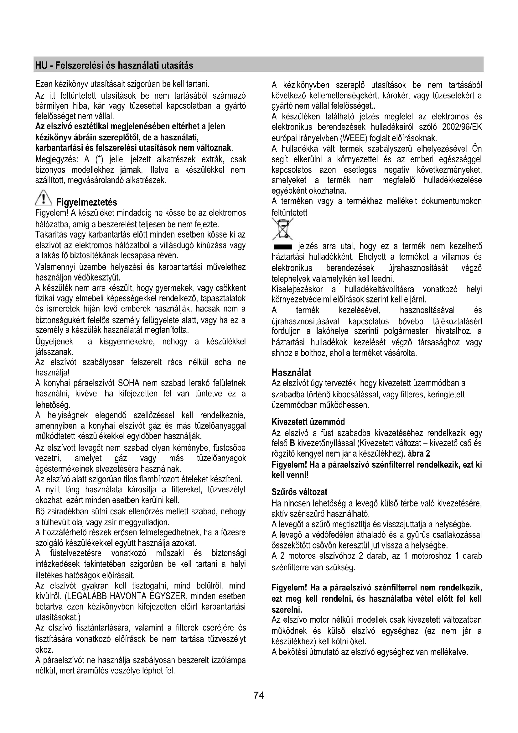 За аспираторите с два мотора са необходими два филтъра с активен въглен и съответно за аспираторите с един мотор, един филтър. Филтърът с активен въглен се запушва приблизително след дълъг период на използване в зависимост от начина на готвене и от това колко често почиствате филтъра . Във всеки случай е необходимо да подменяте филтъра с активен въглен на всеки четири месеца или когато индикаторът за засищане на филтрите показва, че е необходимо. Не се мие нито може да се използва повторно. Фиг. 10 Поставете филтъра с активен въглен над защитната решетка на витлото на мотора, след това завъртете централната дръжка P на филтъра по посока на часовниковата стрелка. За да разглобите филтъра завъртете централната дръжка P в посока обратна на часовниковата стрелка. Подмяна на ел. крушки Фиг. 11 Изключете уреда от ел. мрежата. Внимание! Преди да вземете в ръка ел. крушките проверете дали са изстинали. Подмяна на ел. крушки: Отстранете капака на плафониерата с помощта на малка отвертка или подобен инструмент. Подменете изгорялата крушка. В зависимост от притежавания модел: Използвайте крушки миньонки 40W max (E14) или халогенни лампи 20W max (G4 12V). Затворете плафониерата ( с пружинен механизъм). Ако ел. крушките не светят, проверете дали са монтирани правилно преди да потърсите помощта на специалист.74 HU - Felszerelési és használati utasítás Ezen kézikönyv utasításait szigorúan be kell tartani. Az itt feltüntetett utasítások be nem tartásából származó bármilyen hiba, kár vagy tűzesettel kapcsolatban a gyártó felelősséget nem vállal. Az elszívó esztétikai megjelenésében eltérhet a jelen kézikönyv ábráin szereplőtől, de a használati, karbantartási és felszerelési utasítások nem változnak. Megjegyzés: A (*) jellel jelzett alkatrészek extrák, csak bizonyos modellekhez járnak, illetve a készülékkel nem szállított, megvásárolandó alkatrészek. Figyelmeztetés Figyelem! A készüléket mindaddig ne kösse be az elektromos hálózatba, amíg a beszerelést teljesen be nem fejezte. Takarítás vagy karbantartás előtt minden esetben kösse ki az elszívót az elektromos hálózatból a villásdugó kihúzása vagy a lakás fő biztosítékának lecsapása révén. Valamennyi üzembe helyezési és karbantartási művelethez használjon védőkesztyűt. A készülék nem arra készült, hogy gyermekek, vagy csökkent fizikai vagy elmebeli képességekkel rendelkező, tapasztalatok és ismeretek híján levő emberek használják, hacsak nem a biztonságukért felelős személy felügyelete alatt, vagy ha ez a személy a készülék használatát megtanította. Ügyeljenek a kisgyermekekre, nehogy a készülékkel játsszanak. Az elszívót szabályosan felszerelt rács nélkül soha ne használja! A konyhai páraelszívót SOHA nem szabad lerakó felületnek használni, kivéve, ha kifejezetten fel van tüntetve ez a lehetőség. A helyiségnek elegendő szellőzéssel kell rendelkeznie, amennyiben a konyhai elszívót gáz és más tüzelőanyaggal működtetett készülékekkel egyidőben használják. Az elszívott levegőt nem szabad olyan kéménybe, füstcsőbe vezetni, amelyet gáz vagy más tüzelőanyagok égéstermékeinek elvezetésére használnak. Az elszívó alatt szigorúan tilos flambírozott ételeket készíteni. A nyílt láng használata károsítja a filtereket, tűzveszélyt okozhat, ezért minden esetben kerülni kell. Bő zsiradékban sütni csak ellenőrzés mellett szabad, nehogy a túlhevült olaj vagy zsír meggyulladjon. A hozzáférhető részek erősen felmelegedhetnek, ha a főzésre szolgáló készülékekkel együtt használja azokat. A füstelvezetésre vonatkozó műszaki és biztonsági intézkedések tekintetében szigorúan be kell tartani a helyi illetékes hatóságok előírásait. Az elszívót gyakran kell tisztogatni, mind belülről, mind kívülről. (LEGALÁBB HAVONTA EGYSZER, minden esetben betartva ezen kézikönyvben kifejezetten előírt karbantartási utasításokat.) Az elszívó tisztántartására, valamint a filterek cseréjére és tisztítására vonatkozó előírások be nem tartása tűzveszélyt okoz. A páraelszívót ne használja szabályosan beszerelt izzólámpa nélkül, mert áramütés veszélye léphet fel. A kézikönyvben szereplő utasítások be nem tartásából következő kellemetlenségekért, károkért vagy tűzesetekért a gyártó nem vállal felelősséget.. A készüléken található jelzés megfelel az elektromos és elektronikus berendezések hulladékairól szóló 2002/96/EK európai irányelvben (WEEE) foglalt előírásoknak. A hulladékká vált termék szabályszerű elhelyezésével Ön segít elkerülni a környezettel és az emberi egészséggel kapcsolatos azon esetleges negatív következményeket, amelyeket a termék nem megfelelő hulladékkezelése egyébként okozhatna. A terméken vagy a termékhez melléke