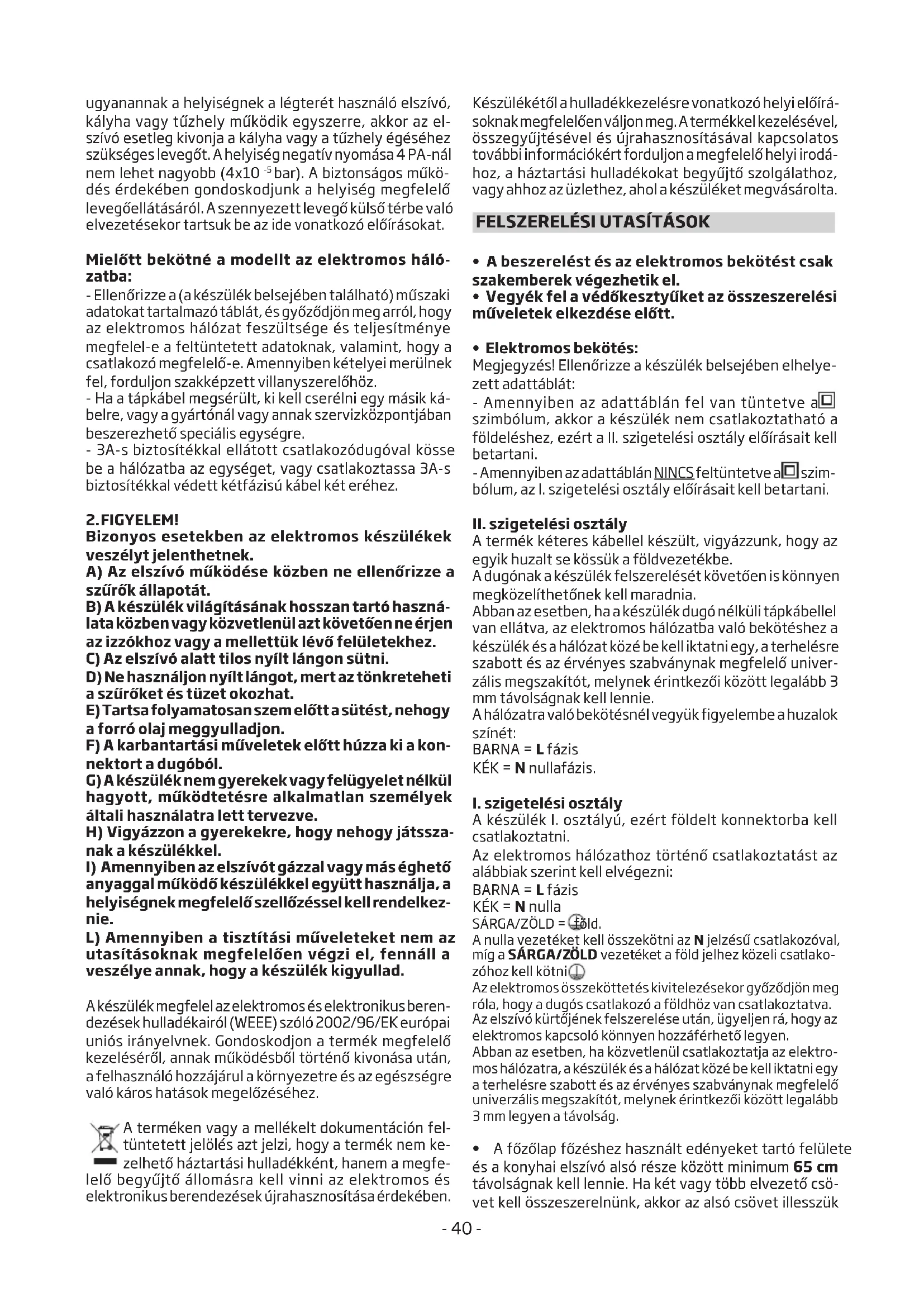A termék kéteres kábellel készült, vigyázzunk, hogy az egyik huzalt se kössük a földvezetékbe. A dugónak a készülék felszerelését követően is könnyen megközelíthetőnek kell maradnia. Abban az esetben, ha a készülék dugó nélküli tápkábellel van ellátva, az elektromos hálózatba való bekötéshez a készülék és a hálózat közé be kell iktatni egy, a terhelésre szabott és az érvényes szabványnak megfelelő univer- zális megszakítót, melynek érintkezői között legalább 3 mm távolságnak kell lennie. A hálózatra való bekötésnél vegyük figyelembe a huzalok színét: BARNA = L fázis KÉK = N nullafázis.