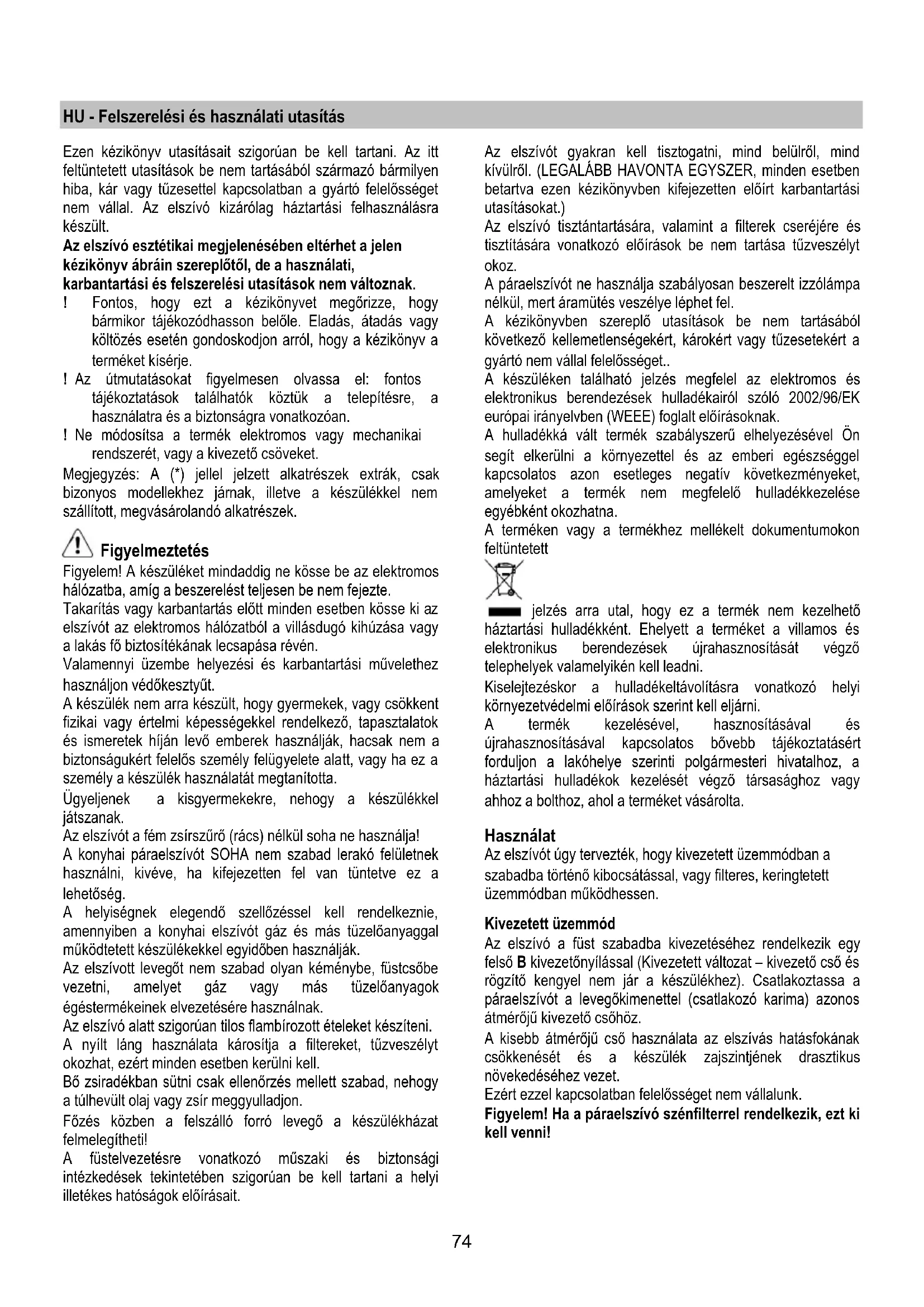 Ezen kézikönyv utası法案t szigoruan be kell tartani. Az itt feltüntetett utası法案k be nem tartasaból szarmazó barmilyen hiba, kár vagy tüzesettel kapcsolatban a gyartó felelosséget nem vällal. Az elszívo kizárolag háztartasi felhasználasra készült.