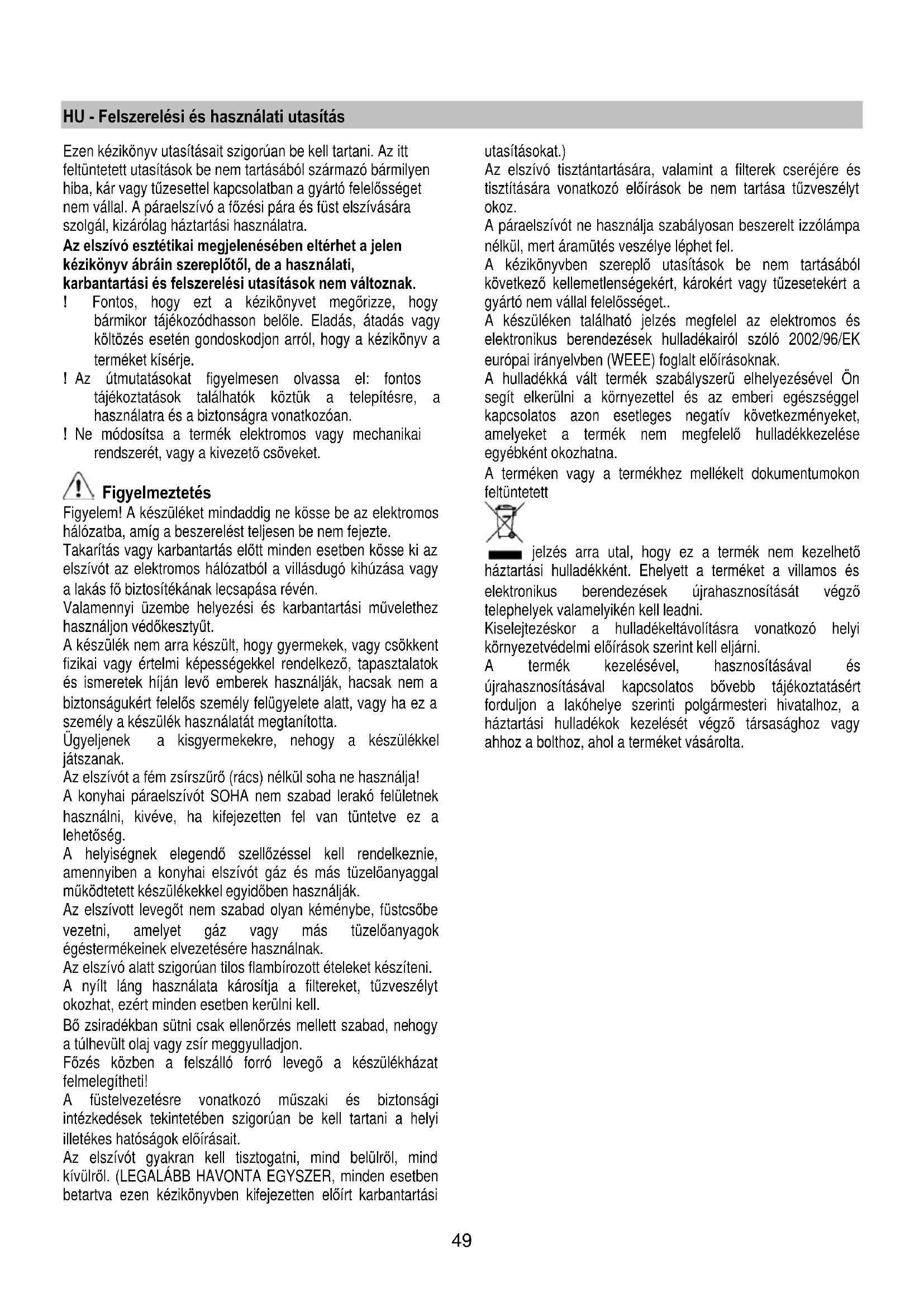 5). Scoateți filtrul. După o curățare minuțioasă a ramei potriviţi noul filtru la măsura corectă și introduceți-l. Asigurați-vă că marcajele colorate de pe filtru sunt orientate spre interior. Filtru de cărbune (numai pentru versiunea filtrantă) Reţine mirosurile neplăcute, derivate în urma procesului de coacere. Saturaţia filtrului de cărbune depinde de folosirea mai mult sau mai puţin prelungită a tipului de maşina de gătit precum şi de curăţarea regulară a filtrului pentru grăsime. În orice caz, cartuşul filtrului trebuie înlocuit cel mult la fiecare patru luni. NU-l spălaţi sau refolosiţi Filtru de cărbune circular Aplicaţi unul pe margine pentru acoperirea ambelor grilaje de protecţie a rotorului motorului, apoi rotiţi în sens orar. Pentru demontare rotiţi în sens antiorar. Înlocuirea becurilor Deconectaţi hota de la reţeaua electrică. Atenţie! Înainte de a atinge becurile, asiguraţi-vă că nu au o temperatură ridicată. Înlocuiţi becul avariat Folosiţi doar becuri cu halogen tip lumânare Ø35 mm E14 28W. Dacă plafoniera nu se aprinde, controlaţi dacă aţi introdus bine becurile înainte de a chema Asistenţa tehnică.49 HU - Felszerelési és használati utasítás Ezen kézikönyv utasításait szigorúan be kell tartani. Az itt feltüntetett utasítások be nem tartásából származó bármilyen hiba, kár vagy tűzesettel kapcsolatban a gyártó felelősséget nem vállal. A páraelszívó a főzési pára és füst elszívására szolgál, kizárólag háztartási használatra. Az elszívó esztétikai megjelenésében eltérhet a jelen kézikönyv ábráin szereplőtől, de a használati, karbantartási és felszerelési utasítások nem változnak. ! Fontos, hogy ezt a kézikönyvet megőrizze, hogy bármikor tájékozódhasson belőle. Eladás, átadás vagy költözés esetén gondoskodjon arról, hogy a kézikönyv a terméket kísérje. ! Az útmutatásokat figyelmesen olvassa el: fontos tájékoztatások találhatók köztük a telepítésre, a használatra és a biztonságra vonatkozóan. ! Ne módosítsa a termék elektromos vagy mechanikai rendszerét, vagy a kivezető csöveket. Figyelmeztetés Figyelem! A készüléket mindaddig ne kösse be az elektromos hálózatba, amíg a beszerelést teljesen be nem fejezte. Takarítás vagy karbantartás előtt minden esetben kösse ki az elszívót az elektromos hálózatból a villásdugó kihúzása vagy a lakás fő biztosítékának lecsapása révén. Valamennyi üzembe helyezési és karbantartási művelethez használjon védőkesztyűt. A készülék nem arra készült, hogy gyermekek, vagy csökkent fizikai vagy értelmi képességekkel rendelkező, tapasztalatok és ismeretek híján levő emberek használják, hacsak nem a biztonságukért felelős személy felügyelete alatt, vagy ha ez a személy a készülék használatát megtanította. Ügyeljenek a kisgyermekekre, nehogy a készülékkel játszanak. Az elszívót a fém zsírszűrő (rács) nélkül soha ne használja! A konyhai páraelszívót SOHA nem szabad lerakó felületnek használni, kivéve, ha kifejezetten fel van tüntetve ez a lehetőség. A helyiségnek elegendő szellőzéssel kell rendelkeznie, amennyiben a konyhai elszívót gáz és más tüzelőanyaggal működtetett készülékekkel egyidőben használják. Az elszívott levegőt nem szabad olyan kéménybe, füstcsőbe vezetni, amelyet gáz vagy más tüzelőanyagok égéstermékeinek elvezetésére használnak. Az elszívó alatt szigorúan tilos flambírozott ételeket készíteni. A nyílt láng használata károsítja a filtereket, tűzveszélyt okozhat, ezért minden esetben kerülni kell. Bő zsiradékban sütni csak ellenőrzés mellett szabad, nehogy a túlhevült olaj vagy zsír meggyulladjon. Főzés közben a felszálló forró levegő a készülékházat felmelegítheti! A füstelvezetésre vonatkozó műszaki és biztonsági intézkedések tekintetében szigorúan be kell tartani a helyi illetékes hatóságok előírásait. Az elszívót gyakran kell tisztogatni, mind belülről, mind kívülről. (LEGALÁBB HAVONTA EGYSZER, minden esetben betartva ezen kézikönyvben kifejezetten előírt karbantartási utasításokat.) Az elszívó tisztántartására, valamint a filterek cseréjére és tisztítására vonatkozó előírások be nem tartása tűzveszélyt okoz. A páraelszívót ne használja szabályosan beszerelt izzólámpa nélkül, mert áramütés veszélye léphet fel. A kézikönyvben szereplő utasítások be nem tartásából következő kellemetlenségekért, károkért vagy tűzes etekért a gyártó nem vállal felelősséget.. A készüléken található jelzés megfelel az elektromos és elektronikus berendezések hulladékairól szóló 2002/96/EK európai irányelvben (WEEE) foglalt előírásoknak. A hulladékká vált termék szabályszerű elhelyezésével Ön segít elkerülni a környezettel és az emberi egészséggel kapcsolatos azon esetleges negatív következményeket, amelyeket a termék nem megfelelő hulladékkezelése egyébként okozhatna. A terméken vagy a termékhez mellékelt dokumentumokon feltüntetett jelzés arra utal, hogy ez a termék nem kezelhető háztartási hulladékként. Ehelyett a terméket a villamos és elektronikus berendezések újrahasznosítását végző telephelyek valamelyikén kell leadni. Kiselejtezéskor a hulladékeltávolításra vonatkozó helyi környezetvédelmi előírások szerint kell eljárni. A termék kezelésével, hasznosításával és újrahasznosításával kapcsolatos bővebb tájékoztatásért forduljon a lakóhelye szerinti polgármesteri hivatalhoz, a háztartási hulladékok kezelését végző társasághoz vagy ahhoz a bolthoz, ahol a terméket vásárolta.50 Használat Az elszívót úgy tervezték, hogy kivezetett üzemmódban a szabadba történő kibocsátással, vagy filteres, keringtetett üzemmódban működhessen. Kivezet