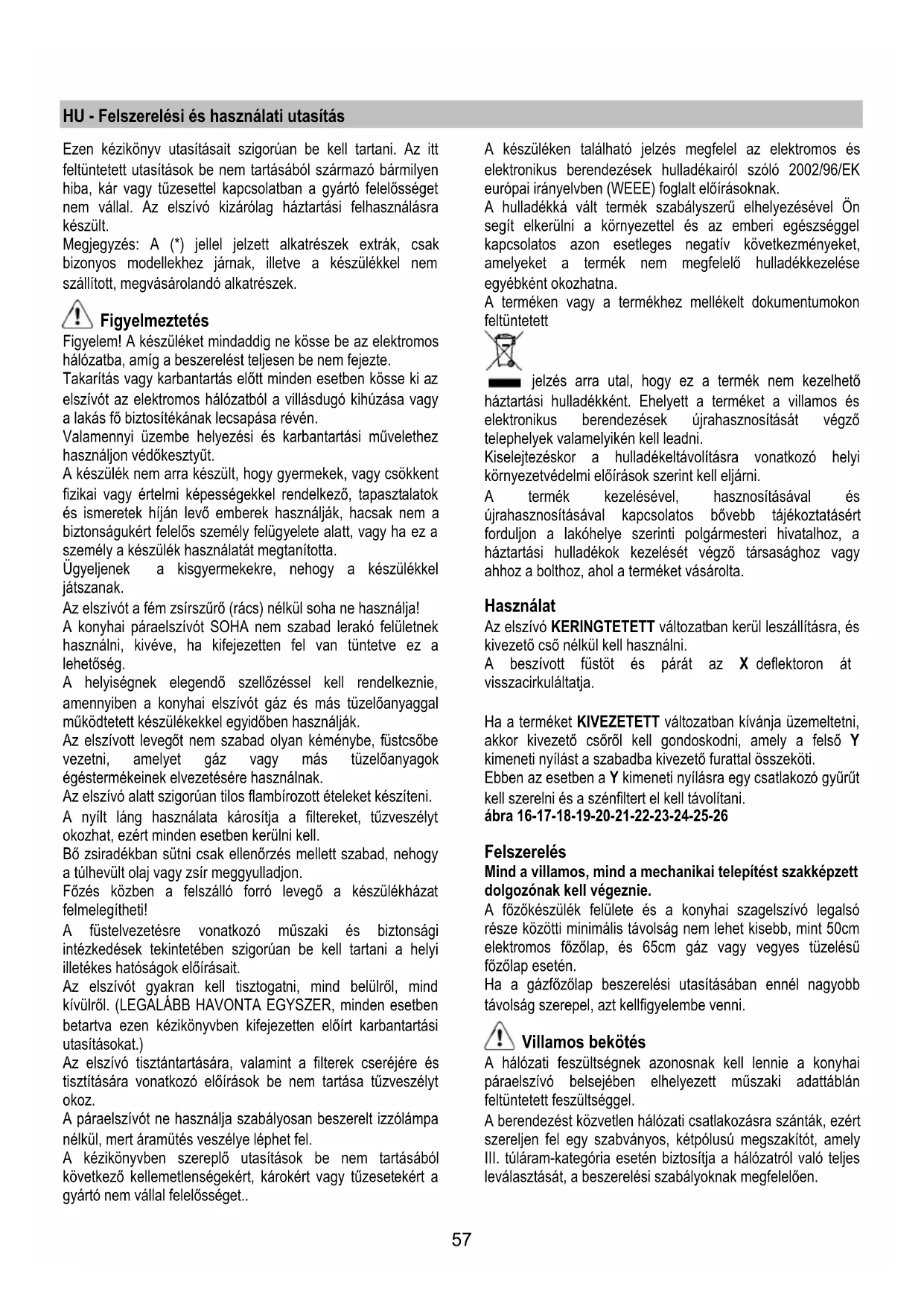 Anumite modele sunt prevăzute cu becuri laterale: Înlocuiţi-le cu aceeaşi formă şi tip, max.40W (E14). Pentru a ajunge la locaşul becurilor, scoateţi capacul A. Dacă plafoniera nu se aprinde, controlaţi dacă aţi introdus bine becurile înainte de a chema Asistenţa tehnică.57 HU - Felszerelési és használati utasítás Ezen kézikönyv utasításait szigorúan be kell tartani. Az itt feltüntetett utasítások be nem tartásából származó bármilyen hiba, kár vagy tűzesettel kapcsolatban a gyártó felelősséget nem vállal. Az elszívó kizárólag háztartási felhasználásra készült. Megjegyzés: A (*) jellel jelzett alkatrészek extrák, csak bizonyos modellekhez járnak, illetve a készülékkel nem szállított, megvásárolandó alkatrészek. Figyelmeztetés Figyelem! A készüléket mindaddig ne kösse be az elektromos hálózatba, amíg a beszerelést teljesen be nem fejezte. Takarítás vagy karbantartás előtt minden esetben kösse ki az elszívót az elektromos hálózatból a villásdugó kihúzása vagy a lakás fő biztosítékának lecsapása révén. Valamennyi üzembe helyezési és karbantartási művelethez használjon védőkesztyűt. A készülék nem arra készült, hogy gyermekek, vagy csökkent fizikai vagy értelmi képességekkel rendelkező, tapasztalatok és ismeretek híján levő emberek használják, hacsak nem a biztonságukért felelős személy felügyelete alatt, vagy ha ez a személy a készülék használatát megtanította. Ügyeljenek a kisgyermekekre, nehogy a készülékkel játszanak. Az elszívót a fém zsírszűrő (rács) nélkül soha ne használja! A konyhai páraelszívót SOHA nem szabad lerakó felületnek használni, kivéve, ha kifejezetten fel van tüntetve ez a lehetőség. A helyiségnek elegendő szellőzéssel kell rendelkeznie, amennyiben a konyhai elszívót gáz és más tüzelőanyaggal működtetett készülékekkel egyidőben használják. Az elszívott levegőt nem szabad olyan kéménybe, füstcsőbe vezetni, amelyet gáz vagy más tüzelőanyagok égéstermékeinek elvezetésére használnak. Az elszívó alatt szigorúan tilos flambírozott ételeket készíteni. A nyílt láng használata károsítja a filtereket, tűzveszélyt okozhat, ezért minden esetben kerülni kell. Bő zsiradékban sütni csak ellenőrzés mellett szabad, nehogy a túlhevült olaj vagy zsír meggyulladjon. Főzés közben a felszálló forró levegő a készülékházat felmelegítheti! A füstelvezetésre vonatkozó műszaki és biztonsági intézkedések tekintetében szigorúan be kell tartani a helyi illetékes hatóságok előírásait. Az elszívót gyakran kell tisztogatni, mind belülről, mind kívülről. (LEGALÁBB HAVONTA EGYSZER, minden esetben betartva ezen kézikönyvben kifejezetten előírt karbantartási utasításokat.) Az elszívó tisztántartására, valamint a filterek cseréjére és tisztítására vonatkozó előírások be nem tartása tűzveszélyt okoz. A páraelszívót ne használja szabályosan beszerelt izzólámpa nélkül, mert áramütés veszélye léphet fel. A kézikönyvben szereplő utasítások be nem tartásából következő kellemetlenségekért, károkért vagy tűzesetekért a gyártó nem vállal felelősséget.. A készüléken található jelzés megfelel az elektromos és elektronikus berendezések hulladékairól szóló 2002/96/EK európai irányelvben (WEEE) foglalt előírásoknak. A hulladékká vált termék szabályszerű elhelyezésével Ön segít elkerülni a környezettel és az emberi egészséggel kapcsolatos azon esetleges negatív következményeket, amelyeket a termék nem megfelelő hulladékkezelése egyébként okozhatna. A terméken vagy a termékhez mellékelt dokumentumokon feltüntetett jelzés arra utal, hogy ez a termék nem kezelhető háztartási hulladékként. Ehelyett a terméket a villamos és elektronikus berendezések újrahasznosítását végző telephelyek valamelyikén kell leadni. Kiselejtezéskor a hulladékeltávolításra vonatkozó helyi környezetvédelmi előírások szerint kell eljárni. A termék kezelésével, hasznosításával és újrahasznosításával kapcsolatos bővebb tájékoztatásért forduljon a lakóhelye szerinti polgármesteri hivatalhoz, a háztartási hulladékok kezelését végző társasághoz vagy ahhoz a bolthoz, ahol a terméket vásárolta. Használat Az elszívó KERINGTETETT változatban kerül leszállításra, és kivezető cső nélkül kell használni. A beszívott füstöt és párát az X deflektoron át visszacirkuláltatja. Ha a terméket KIVEZETETT változatban kívánja üzemeltetni, akkor kivezető csőről kell gondoskodni, amely a felső Y kimeneti nyílást a szabadba kivezető furattal összeköti. Ebben az esetben a Y kimeneti nyílásra egy csatlakozó gyűrűt kell szerelni és a szénfiltert el kell távolítani. ábra 16-17-18-19-20-21-22-23-24-25-26 Felszerelés Mind a villamos, mind a mechanikai telepítést szakképzett dolgozónak kell végeznie. A főzőkészülék felülete és a konyhai szagelszívó legalsó része közötti minimális távolság nem lehet kisebb, mint 50cm elektromos főzőlap, és 65cm gáz vagy vegyes tüzelésű főzőlap esetén. Ha a gázfőzőlap beszerelési utasításában ennél nagyobb távolság szerepel, azt kellfigyelembe venni. Villamos bekötés A hálózati feszültségnek azonosnak kell lennie a konyhai páraelszívó belsejében elhelyezett műszaki adattáblán feltüntetett feszültséggel. A berendezést közvetlen hálózati csatlakozásra szánták, ezért szereljen fel egy szabványos, kétpólusú megszakítót, amely