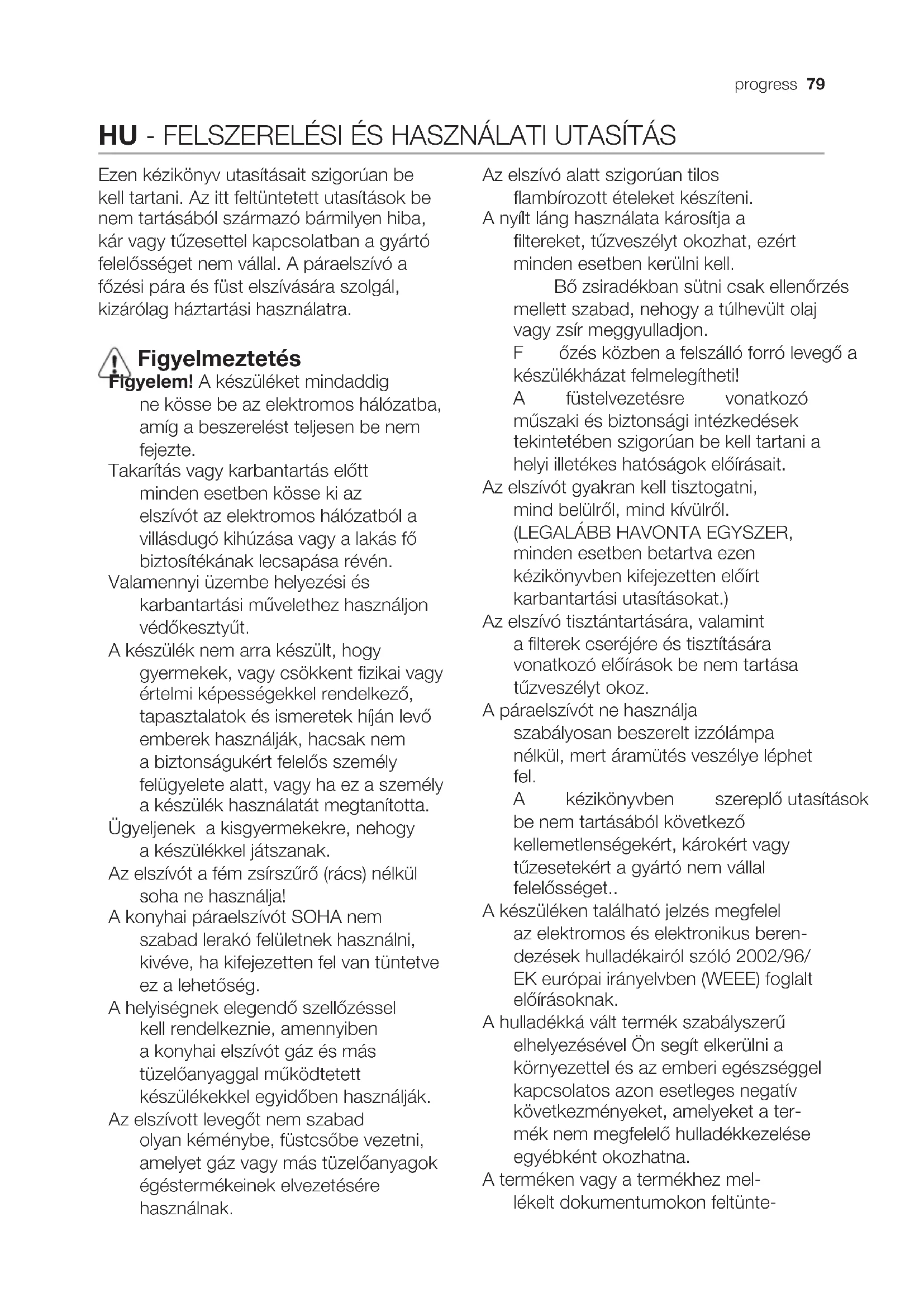Figyelem! Az elszívo tisztn tartása, valamint a filtrerek cseréjere vonatkozó elóirások be nem tartasa tuzveszélyt okoz. Ezert felhívuk figyelmét, hogy tartsa be az utasításokat.