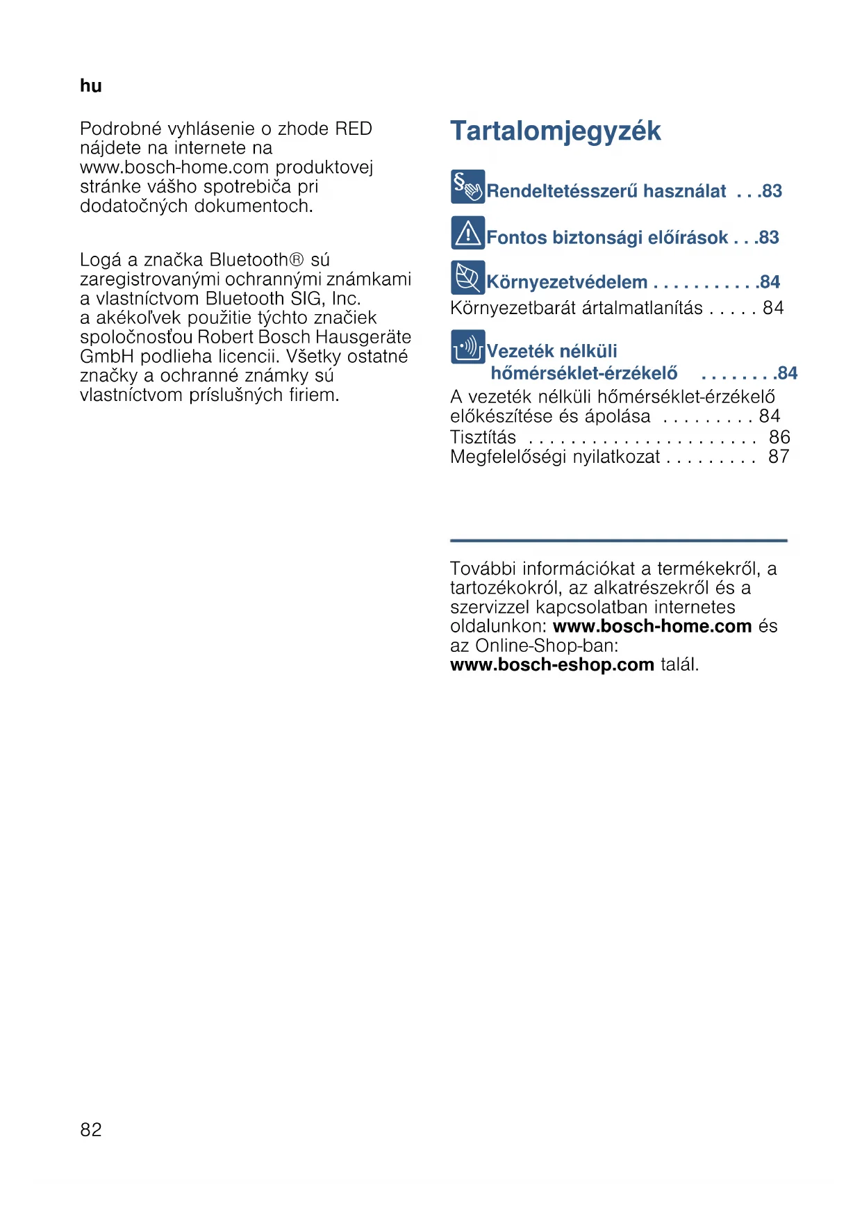- Podrobné vyhlásenie o zhode RED nájdete na internete na www.bosch-home.com produktovej stránke vášho spotrebiča pri dodatočných dokumentoch. Logá a značka Bluetooth® sú zaregistrovanými ochrannými známkami a vlastníctvom Bluetooth SIG, Inc. a akékoľvek použitie týchto značiek spoločnosťou Robert Bosch Hausgeräte GmbH podlieha licencii. Všetky ostatné značky a ochranné známky sú vlastníctvom príslušných firiem. Tartalomjegyzék huHa s z n á l a t i ut así t ás 8 Rendeltetésszerű használat p. 83
