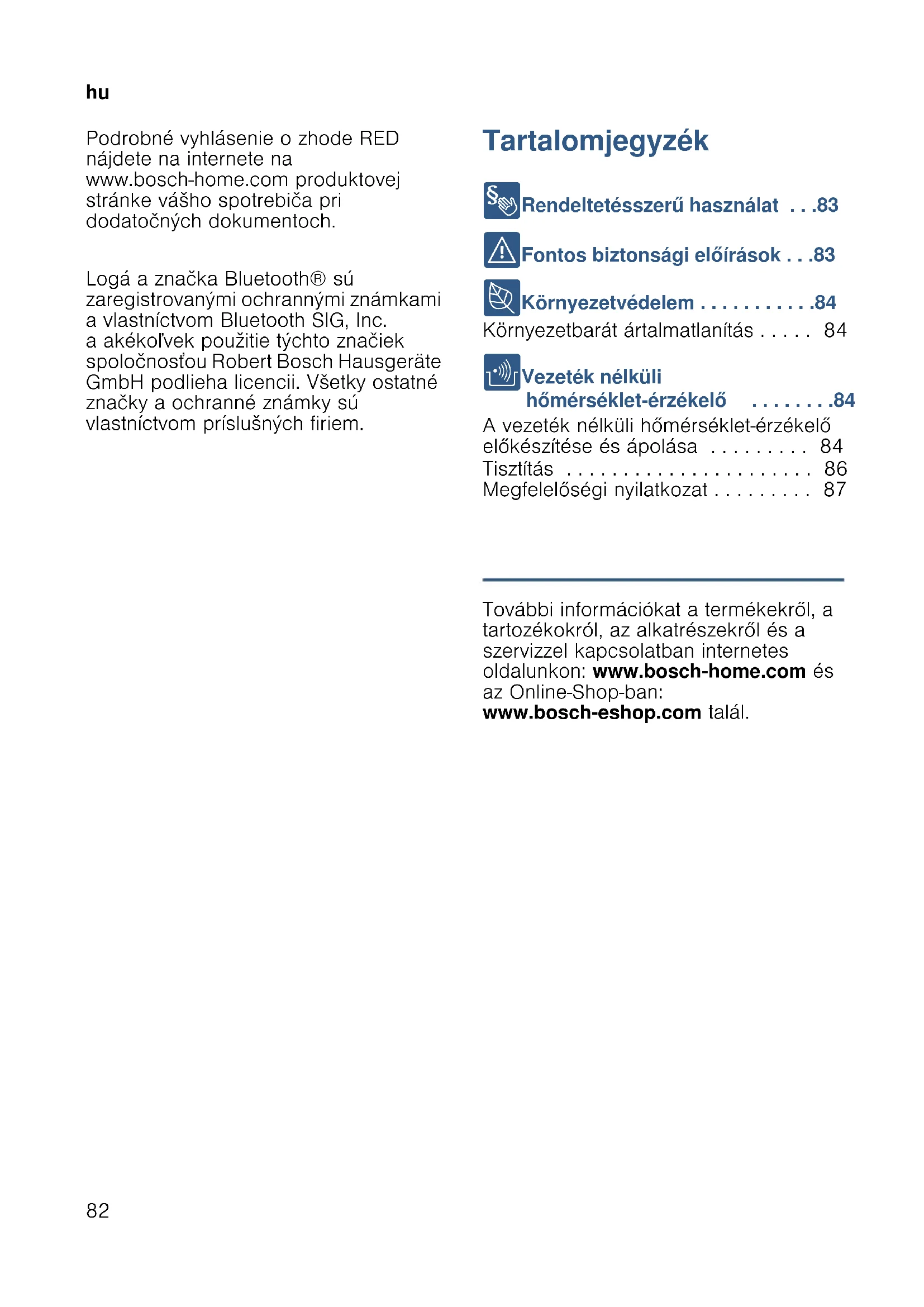 - Megfelelőségi nyilatkozat Termékinfó További információkat a termékekről, a tartozékokról, az alkatrészekről és a szervizzel kapcsolatban internetes oldalunkon: www.bosch-home.com és az Online-Shop-ban: www.bosch-eshop.com talál.hu p. 87