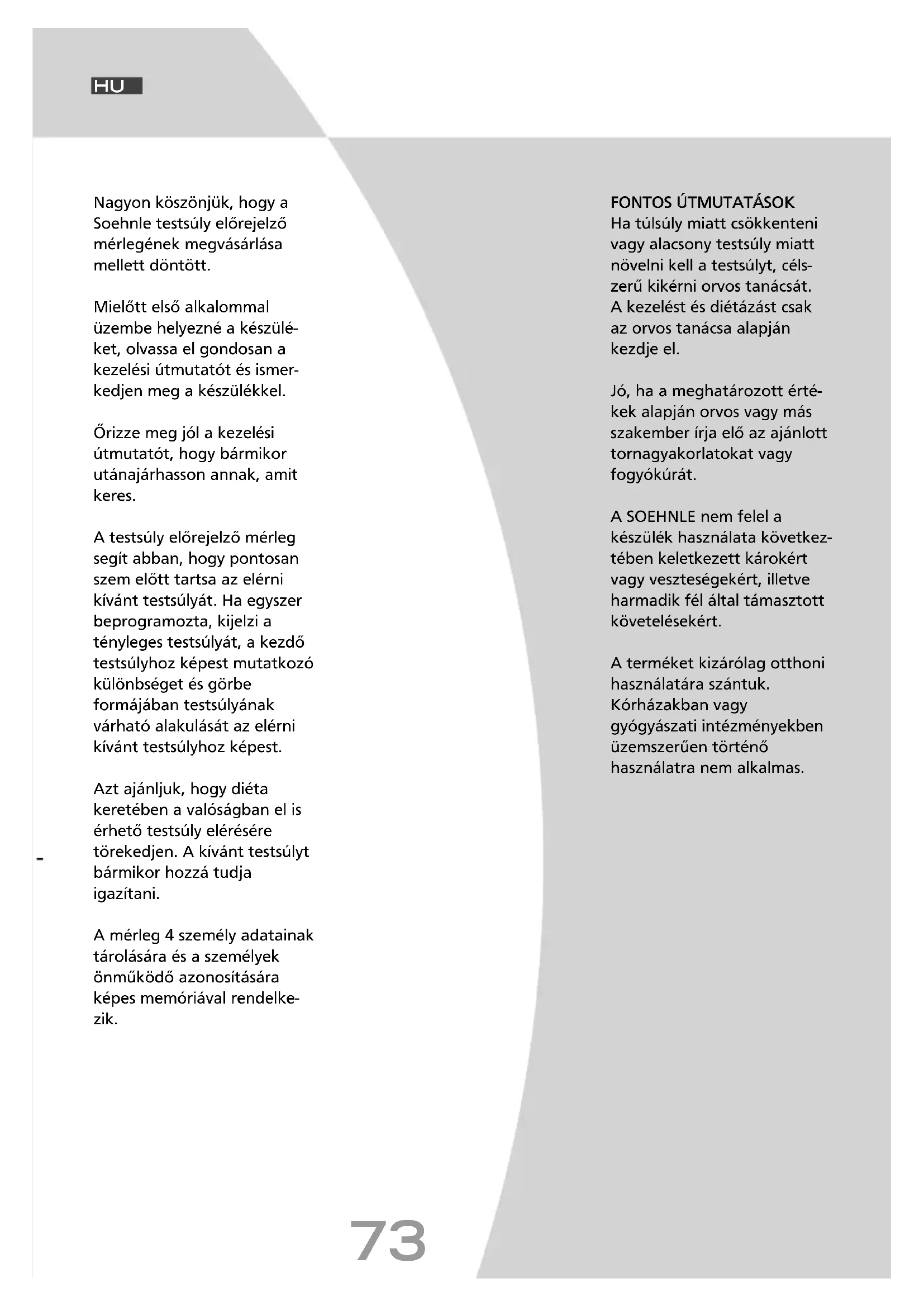 Kysymyksiä ja ehdotuksia var- ten olemme mielellämme käy- tettävissäsi seuraavien yhteys- partneriemme avulla: Kuluttajapalvelu Puh.: (08 00) 5 34 34 34 Maanantaista torstaihin klo 09:00 - klo 12:15 ja klo 13:00 - klo 16:00 Perjantaisin klo 09:00 - klo 12:15 ja klo 13:00 - klo 15:00 TAKUUTODISTUS Tarvitessasi takuuta toimita vaaka yhdessä takuutodistuksen ja ostokuitin kanssa myyjällesi. Lähettäjä Reklamaation syy Tämä laite on häiriövaimen- nettu voimassa olevan EU-direktiivin 89/336/ETY mukaan. Ohje: Äärimmäisten sähkömagneettisten olosuh- teiden vallitessa, esim. käytettäessä radiolähetintä laitteen välittömässä läheisyydessä, näyttöarvo saattaa muuttua. Häiriön päättyessä tuote on jälleen käytettävissä tarkoituksenmu- kaisesti, tarvittaessa tuote on kytkettävä uudelleen päälle. FIN BA63150tendence117634_V8.qxd 07.02.2007 7:09 Uhr Seite 7273 Nagyon köszönjük, hogy a Soehnle testsúly előrejelző mérlegének megvásárlása mellett döntött. Mielőtt első alkalommal üzembe helyezné a készülé- ket, olvassa el gondosan a kezelési útmutatót és ismer- kedjen meg a készülékkel. Őrizze meg jól a kezelési útmutatót, hogy bármikor utánajárhasson annak, amit keres. A testsúly előrejelző mérleg segít abban, hogy pontosan szem előtt tartsa az elérni kívánt testsúlyát. Ha egyszer beprogramozta, kijelzi a tényleges testsúlyát, a kezdő testsúlyhoz képest mutatkozó különbséget és görbe formájában testsúlyának várható alakulását az elérni kívánt testsúlyhoz képest. Azt ajánljuk, hogy diéta keretében a valóságban el is érhető testsúly elérésére törekedjen. A kívánt testsúlyt bármikor hozzá tudja igazítani. A mérleg 4 személy adatainak tárolására és a személyek önműködő azonosítására képes memóriával rendelke- zik.