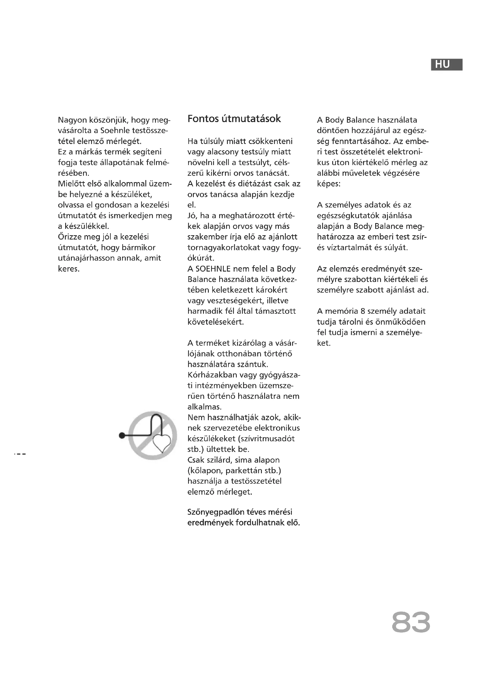 FONTOS! A termek elektronikajt vagy hazat nem szabad megvaltoztatni, ha ehvez nem jarult hozza a Soehnle elozetesen; ha nem tartja be ezr a rendelkezest, bizonyos esetben viszzavonhatjak a Keszulek Uzemeltetesi engedelyet.