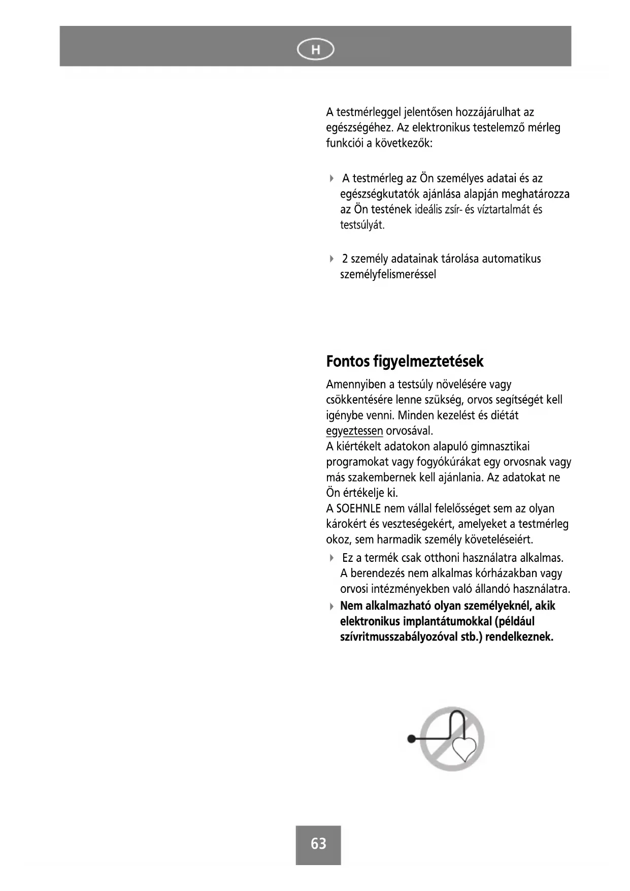 gyeztessen orvosával. A kiértékelt adatokon alapuló gimnasztikai programokat vagy fogyókúrákat egy orvosnak vagy más szakembernek kell ajánlania. Az adatokat ne Ön értékelje ki. A SOEHNLE nem vállal felelősséget sem az olyan károkért és veszteségekért, amelyeket a testmérleg okoz, sem harmadik személy követeléseiért. Ez a termék csak otthoni használatra alkalmas. A berendezés nem alkalmas kórházakban vagy orvosi intézményekben való állandó használatra.